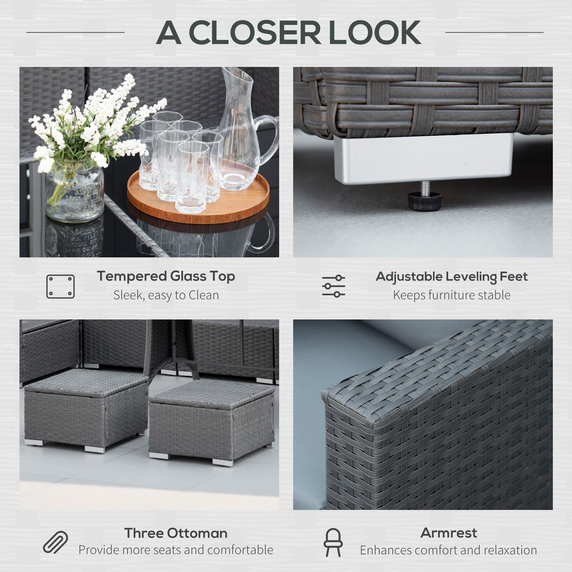 Include: 3 x corner sofa, 3 x armless sofa, 3 x footrest, 1 x table, 7 x seat cushion, 7 x back cushion, 3 x footrest cushion, 4 x throw pillow