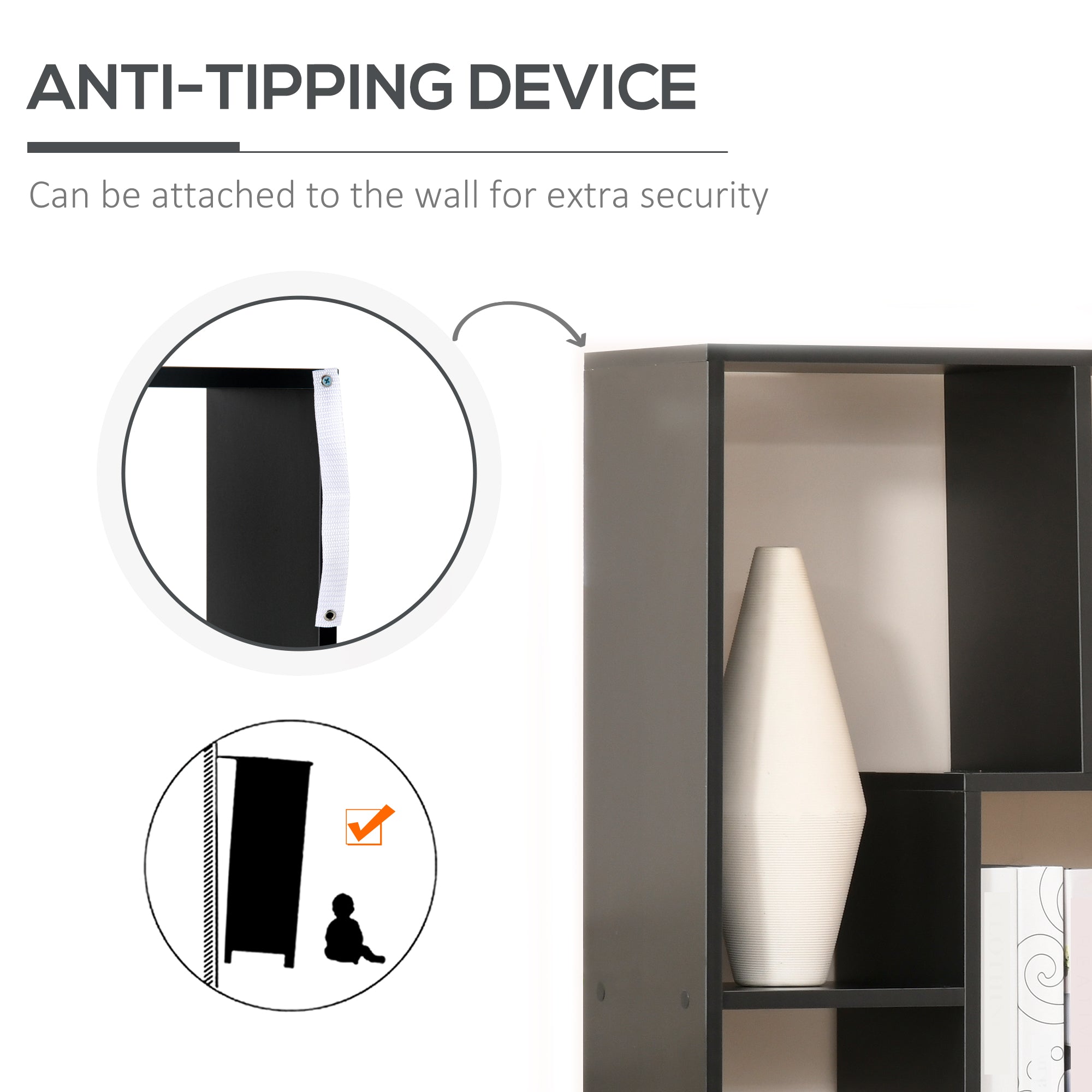 Anti-tipping design, bookcase back features attachments to secure to the wall - perfect for homes with children and pets