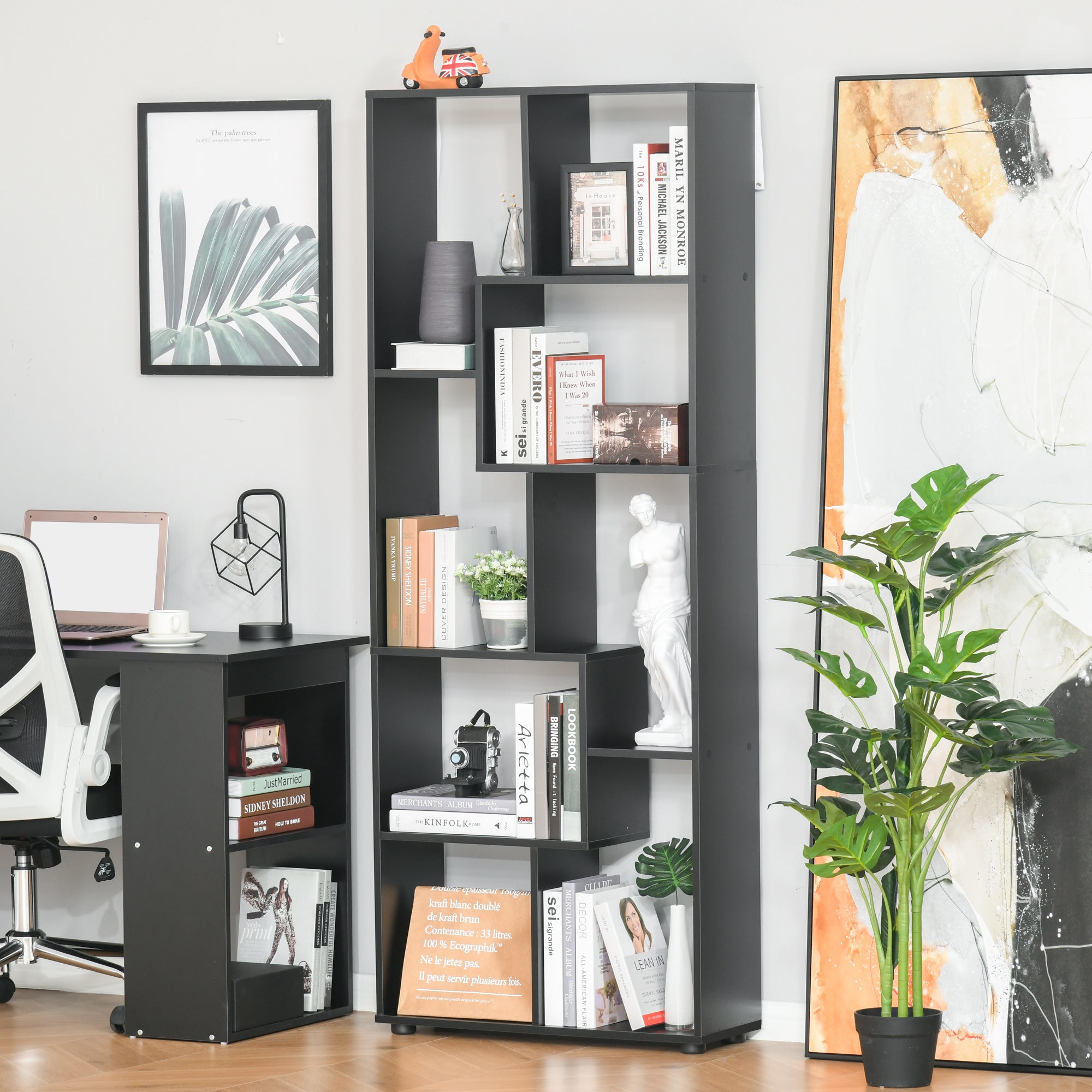 A must for all the book lovers out there - let this bookshelf from let you show off your impressive collection with pride. Using thick particle board for a structure which supports up to 80kg, the frame is crafted into a simple design, where eight differently sized and separate compartments are intertwined into each over for a unique look youll love for years to come. On the bottom, foot pads are placed to promote balance and protect your floor, whilst attachments can be found on the back to secure to the wall - keeping the unit safely in place around to prevent it tipping over. A minimal design with maximum impact.