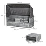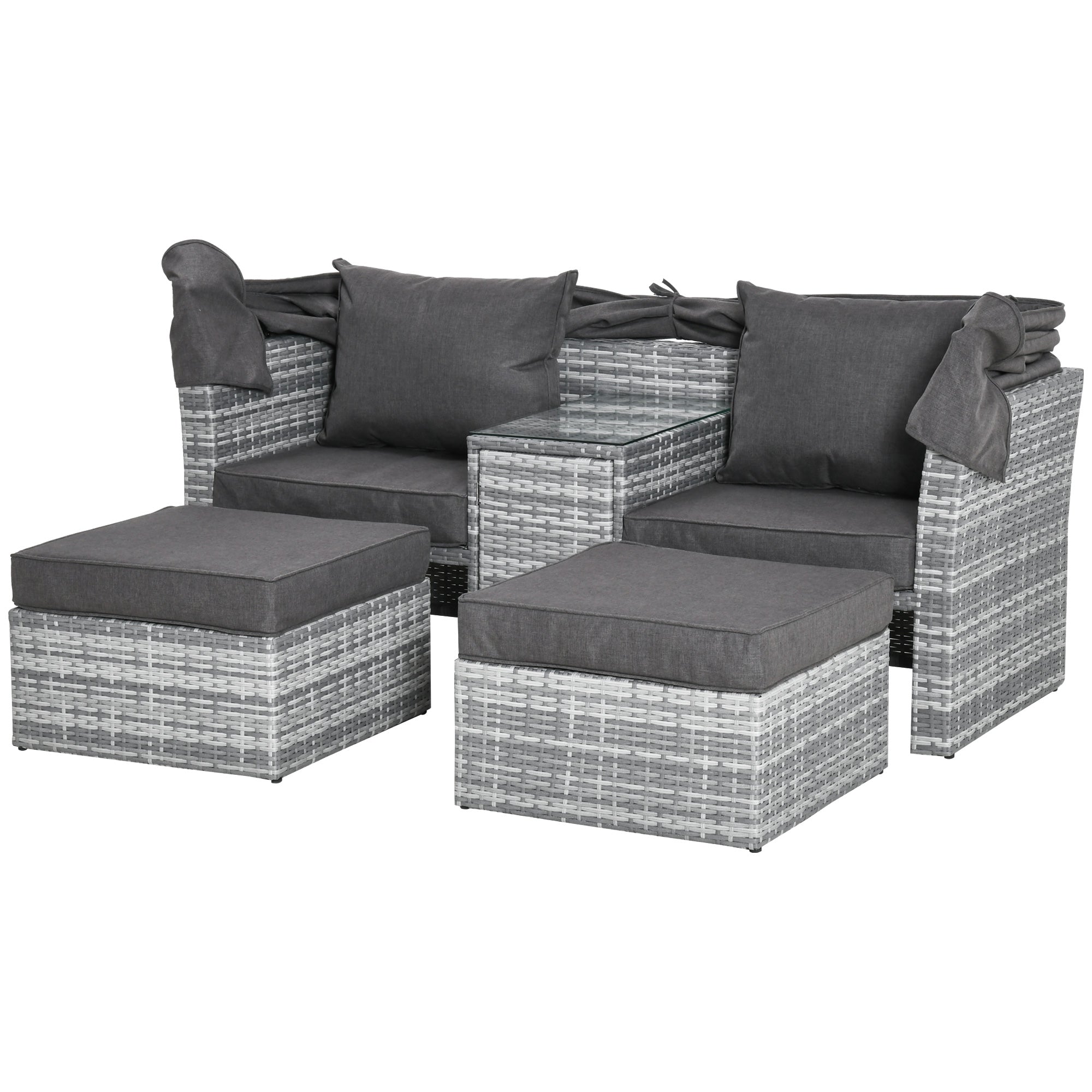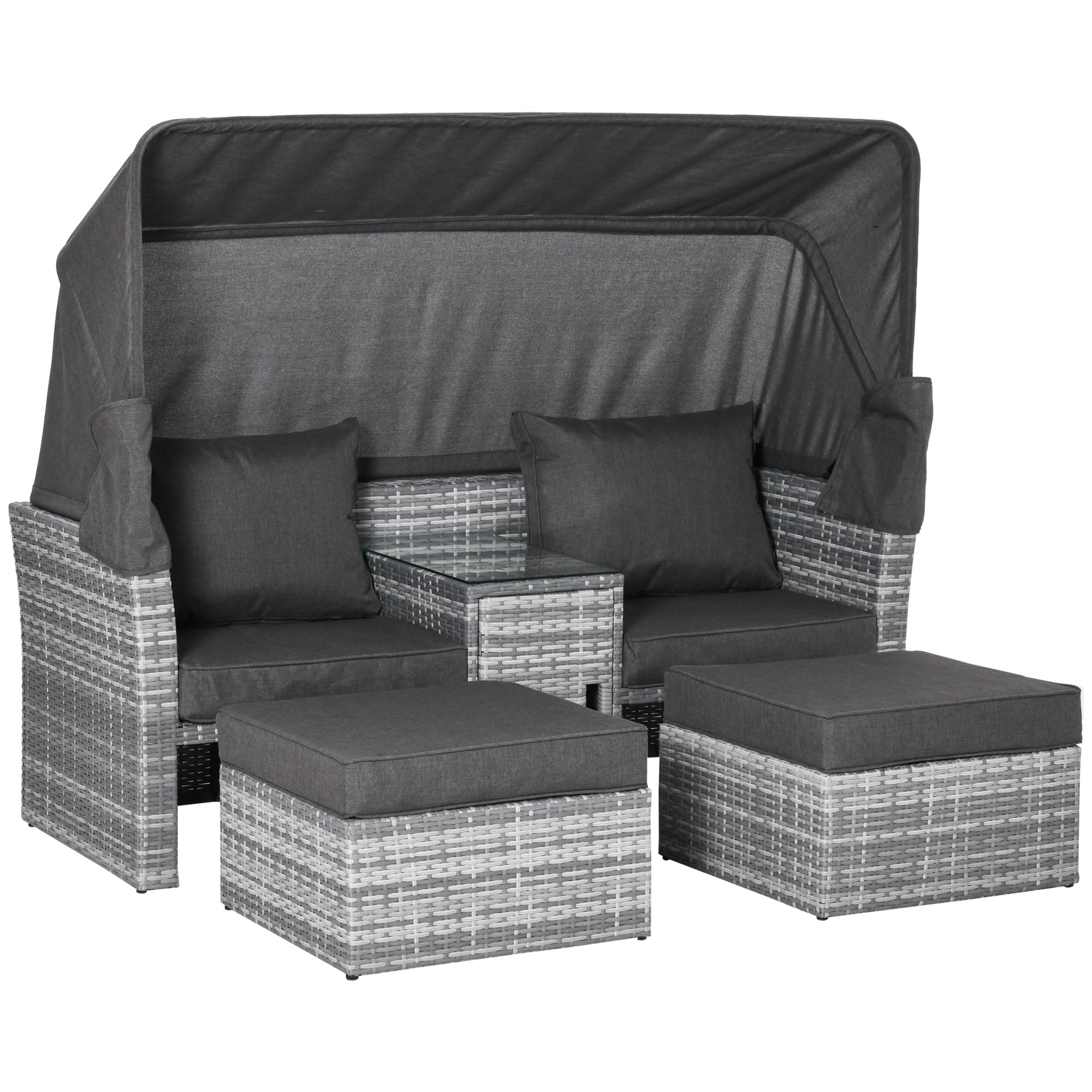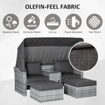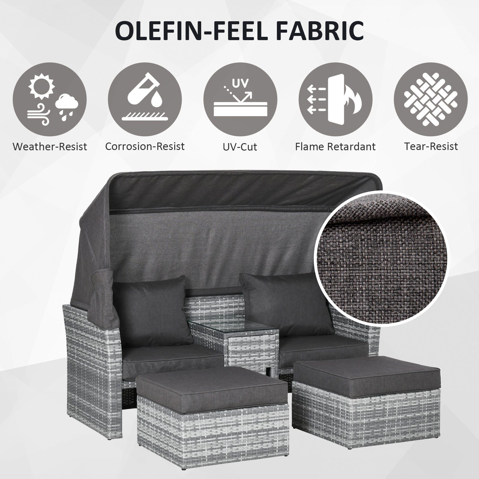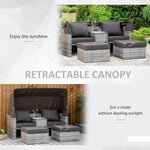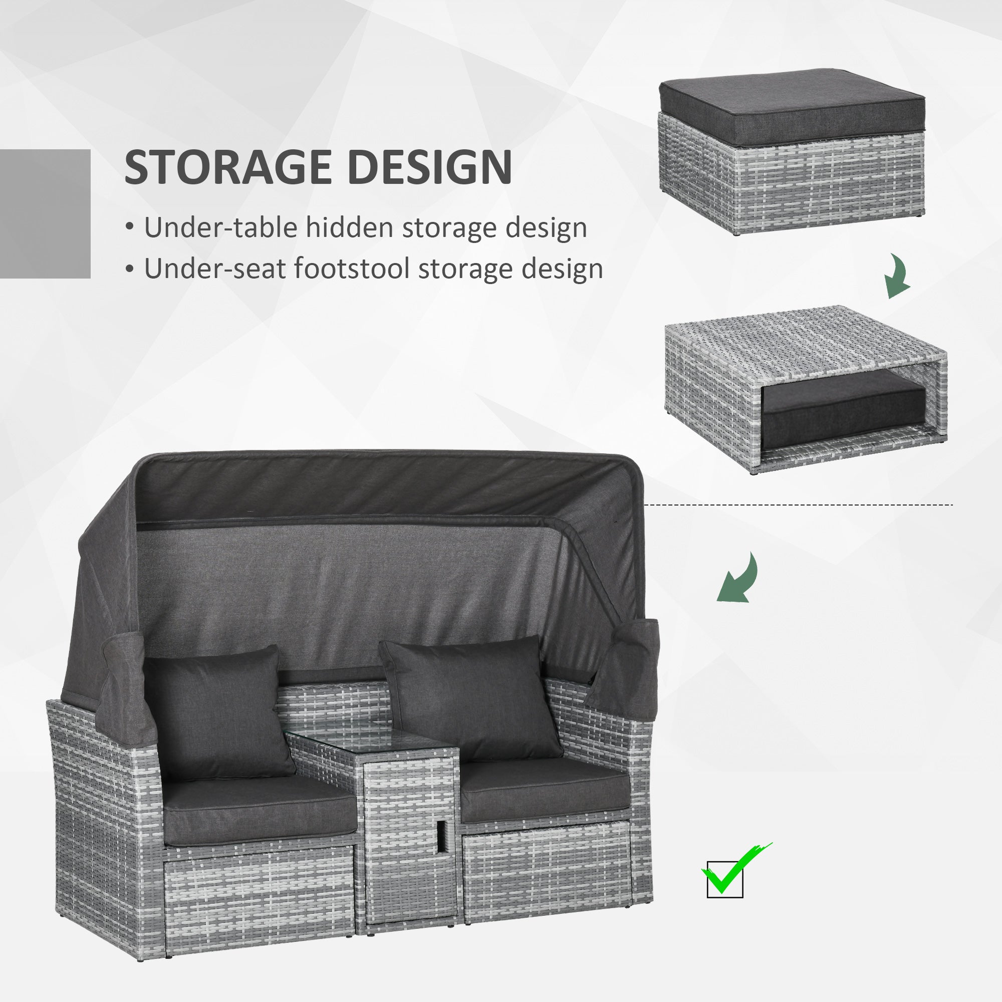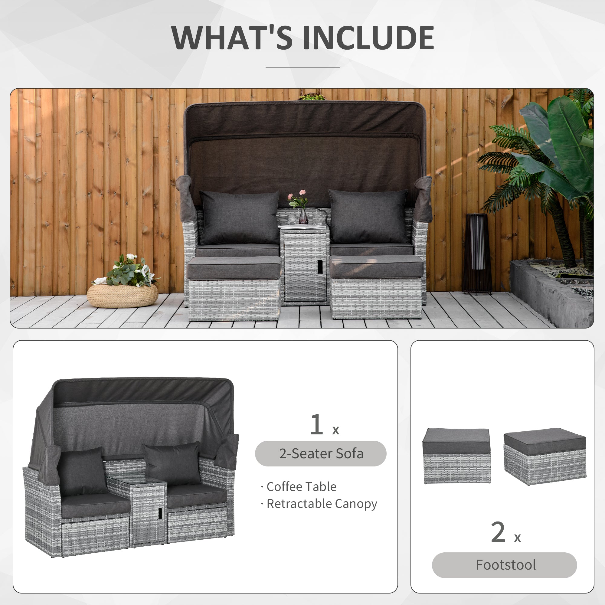 2-Seater Outdoor Rattan Daybed Sofa Footstool Coffee Table Set w/ Canopy, Cushion