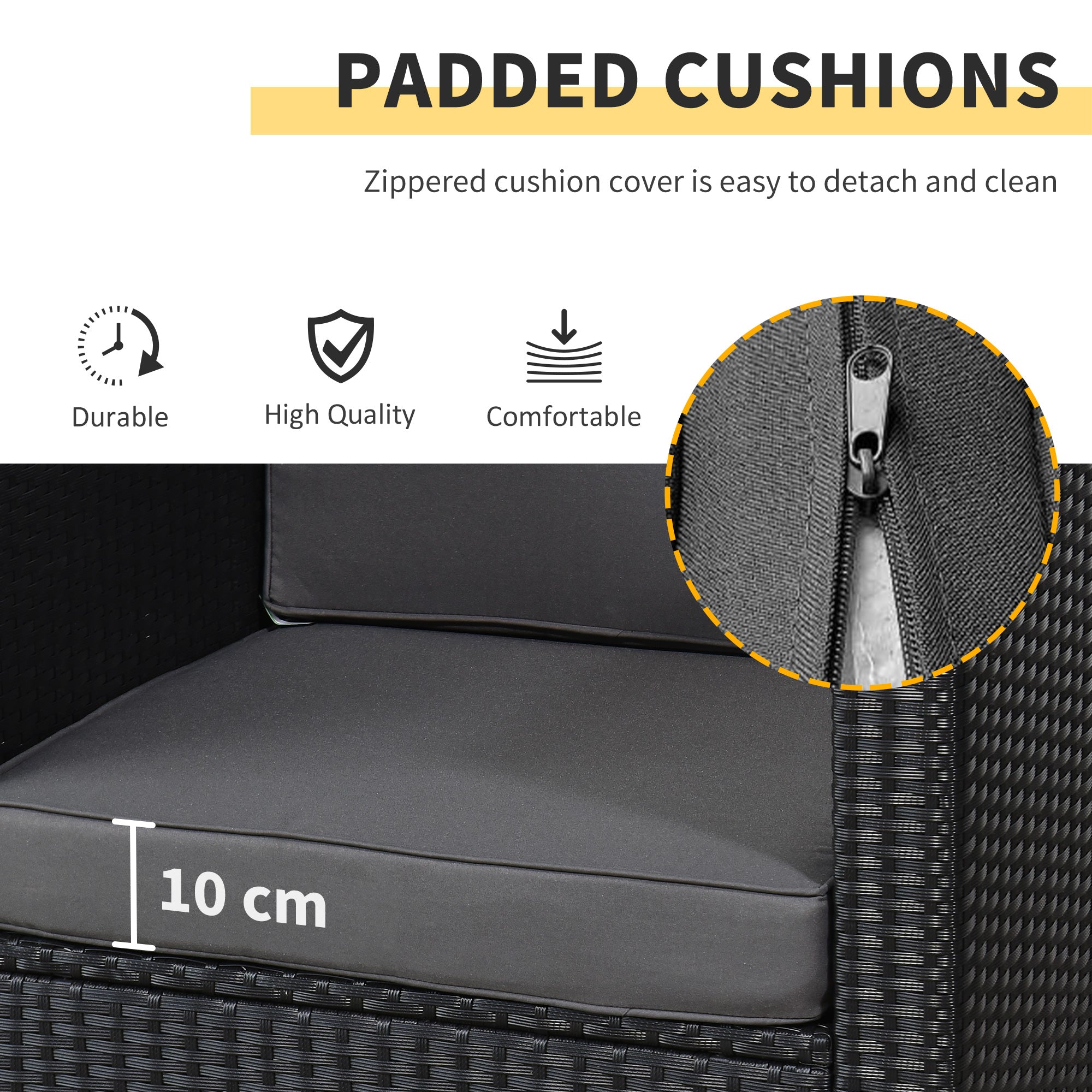 Comfortable and thick padded cushions with removable covers for easy maintenance
