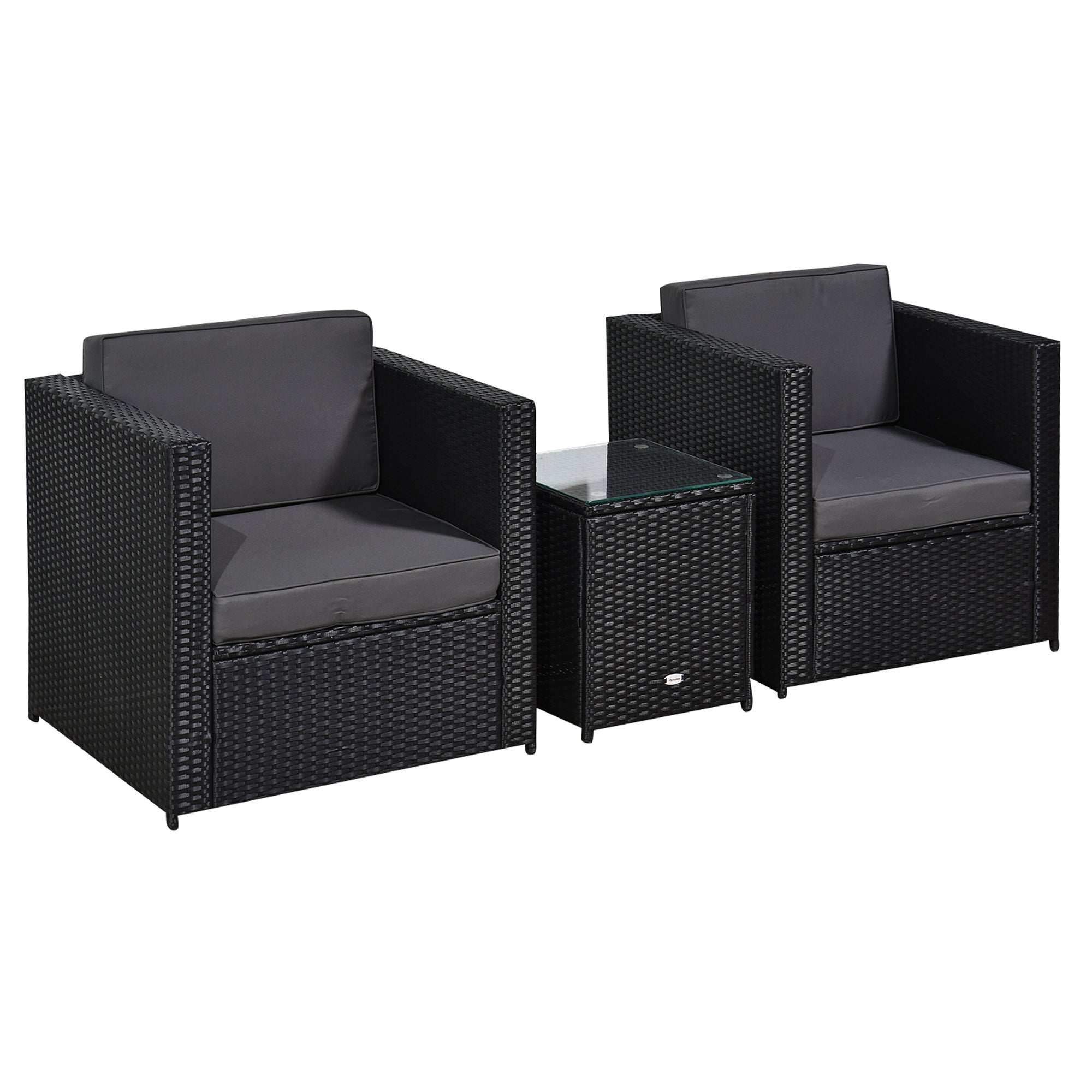 Sit back and relax in the comfort of your own garden with this three-piece chair and table set. Made from high-quality, hand woven PE wicker rattan with a metal frame underneath. Also weather resistant, thanks to the padded cushions, support back and wide seats - perfect for curling up and relaxing away the day in the sun. A thick tempered glass top on the table adds a sleek finishing touch thats easy to look after. It's ideal for catching up with a friend whilst the sun shines.