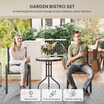 For all outdoor spaces, comes this three-piece garden table and chairs. It comes with two chairs and a small round table: sit with company. The conservatory furniture set is made from powder coated steel, so all bistro table and chairs are tough and will support you fully. The breathable mesh panels on the seats help to keep you cool; the chairs come with a high back and curved arms to support the body.