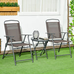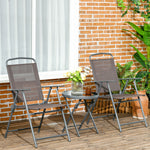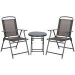 This set comes with a round table and two matching chairs - enjoy time outdoors with company, practically anywhere. Powder coated metal frames mean strong cores to support you. Each piece is foldable - easy to carry and store away. The table is fitted with a tempered glass top - a sleek and safe finishing touch.