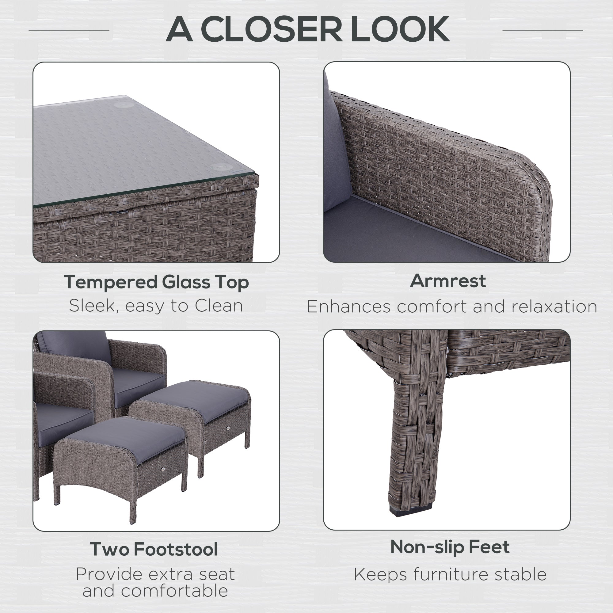 Kick back and relax in complete comfort with this rattan chair and stool set. Formed of five pieces, the set features two arm chairs, two footstools and a matching coffee table. Made from hand woven PE rattan, each piece is weather resistant and low maintenance, with a steel frame underneath for extra support and stability. Two plush cushions on each chair ensure youll be relaxing comfortably for hours on end, with the removable covers making them easy to take off and clean. With a tough tempered glass top, the table is also easy to clean, making this set a fantastic combination of style, comfortable and minimal hassle.
