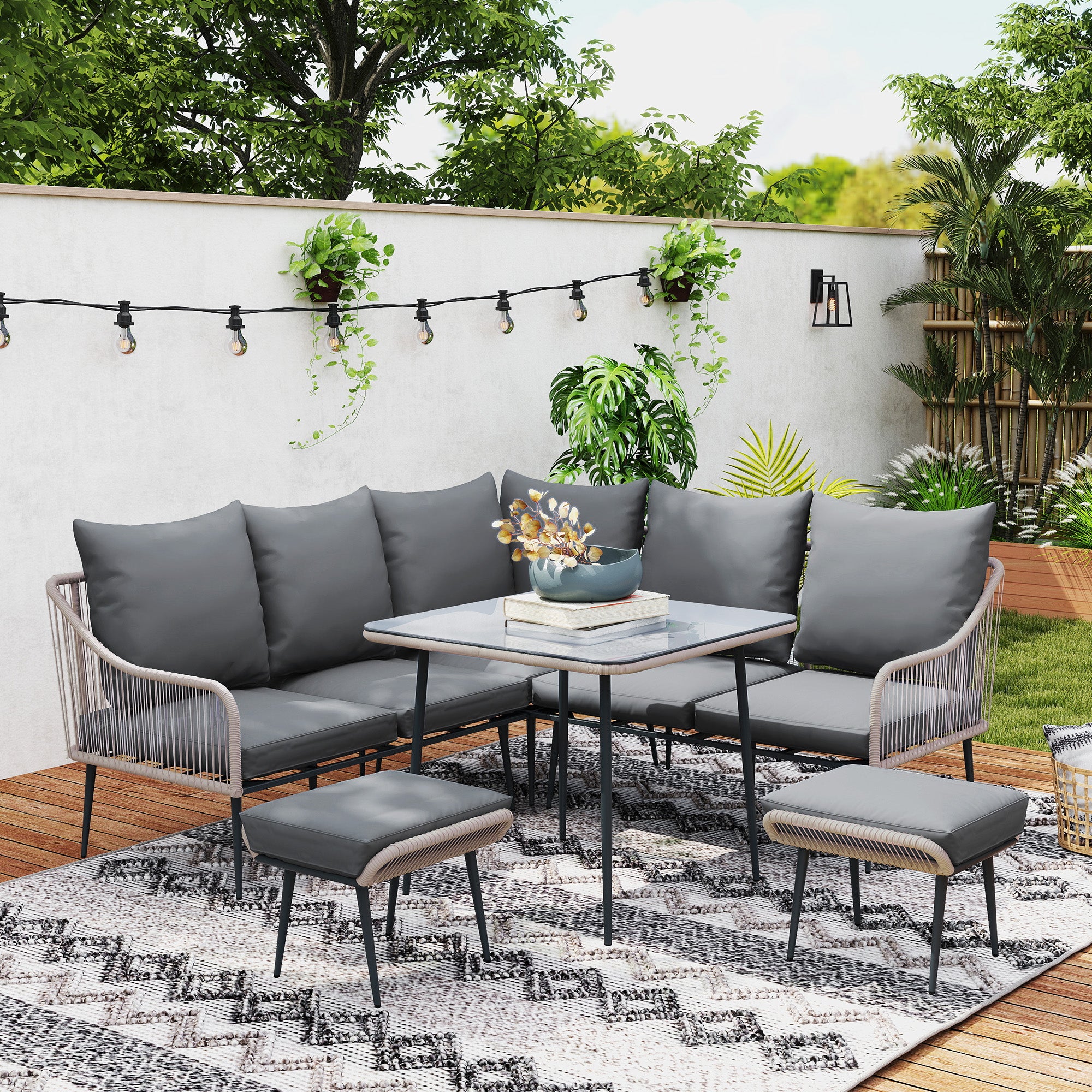 Simple and sleek, finished with total comfort - this garden sofa set ticks all the right boxes. The outdoor furniture set comes with six pieces: two loveseats, a corner chair, two footstools and a square table. Steel frames mean a strong core, with the rattan string panels adding a delicate style. The thickened padded cushions on the seats and back of this garden lounge set allow you to relax comfortably. The glass tabletop adds a sleek finishing touch.