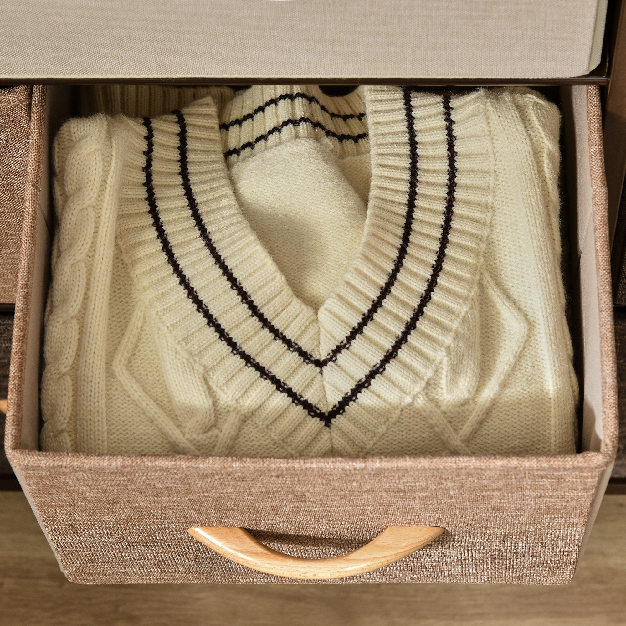 Linen-feel drawers can be removed and folded. Comes with handle to open and close