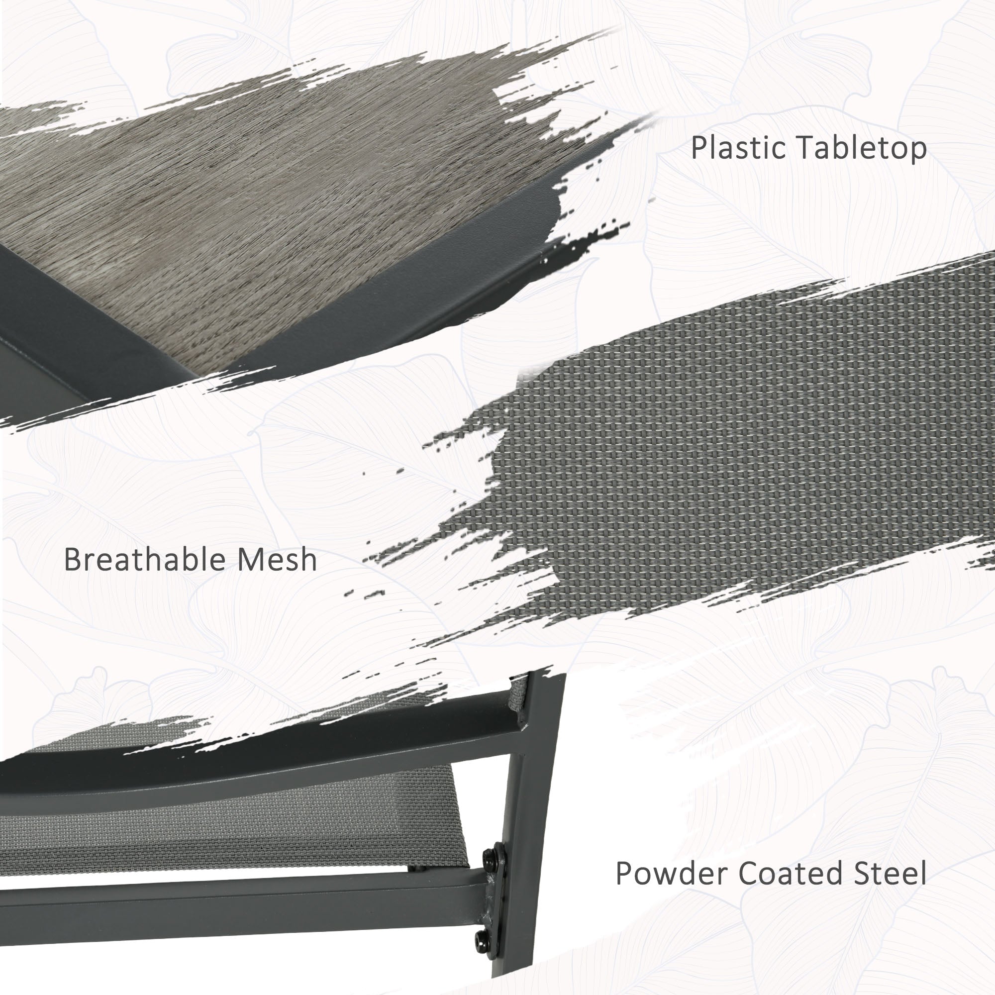 Let the rustic design of this dining set effortlessly blend in with your outdoors. The multi-tone faded tabletop is beautiful and eye-catching; matches the overall dark aesthetic of the set. Powder coated steel frames mean strong and supportive pieces; the chairs have mesh fabric to hold you comfortably. Set comes with one large dining table and six chairs - enjoy outdoors with company.