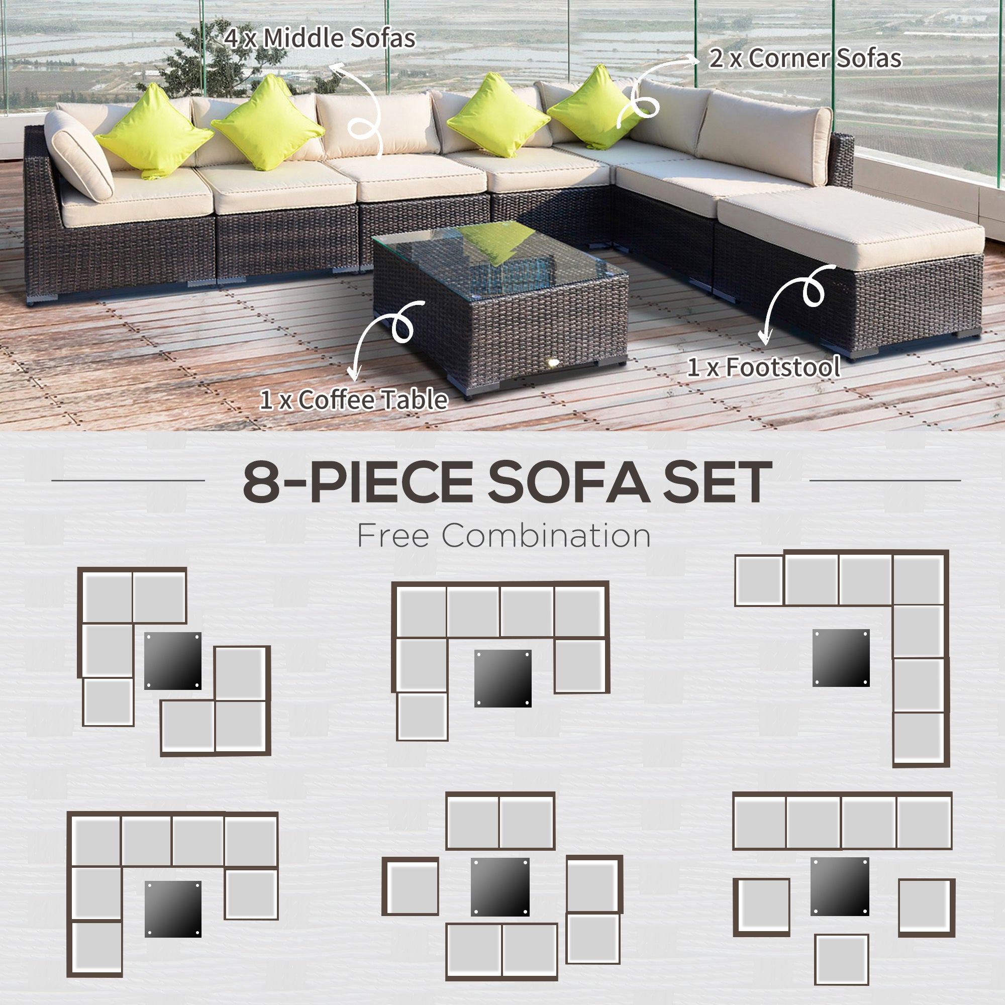 Make your garden stand out like never before with this beautiful outdoor corner sofa. Using aluminum for the base frame of the garden sofa to create a long-term and stable structure, each of the eight pieces included (two corner seats, four normal seats, a footstool, and table) are wrapped in mixed-grey rattan to ensure strength of the conservatory furniture, with a smooth finish that can be wiped clean easily. Padded seats and back cushions provide comfort.