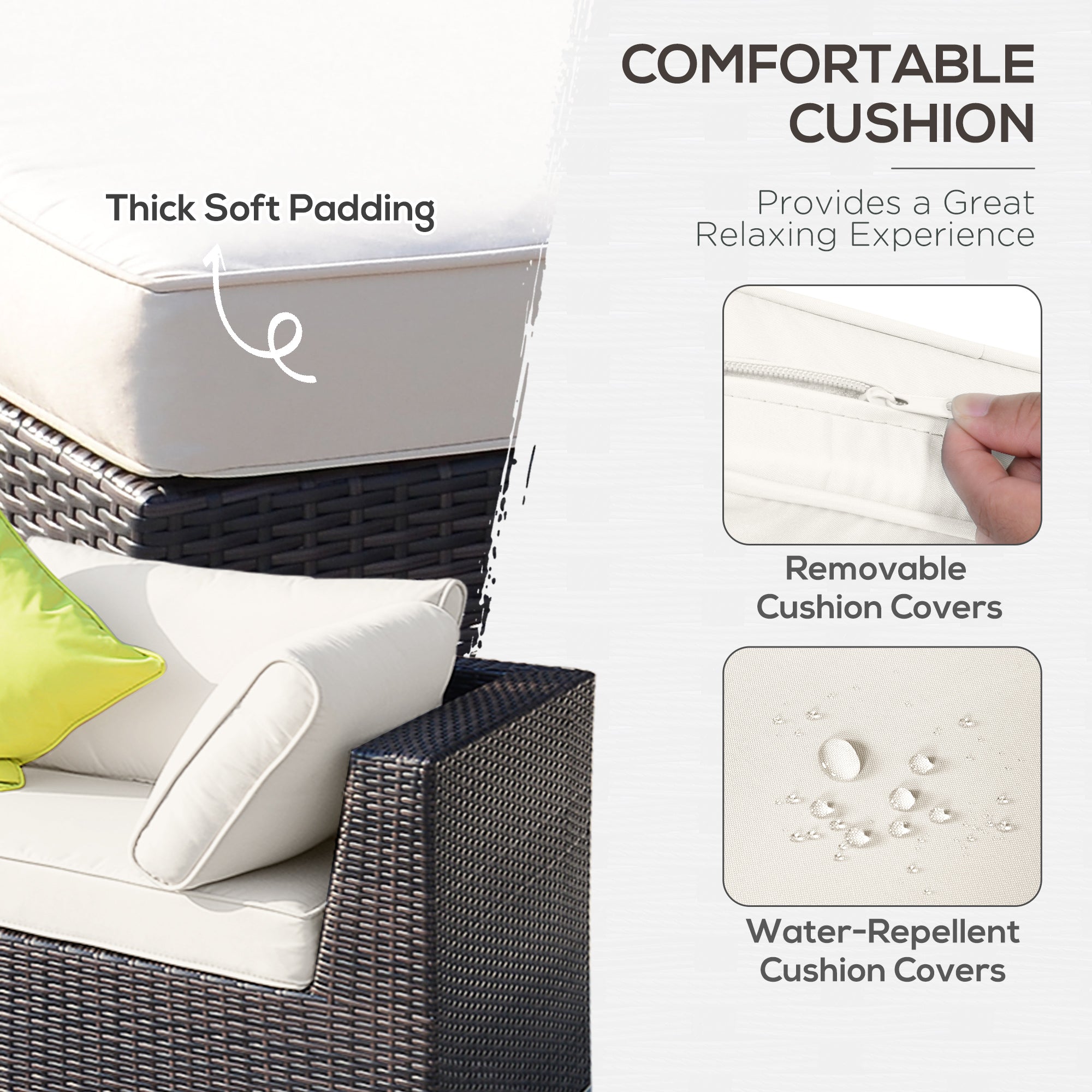 Thick grey seat and back cushions to sink in and relax