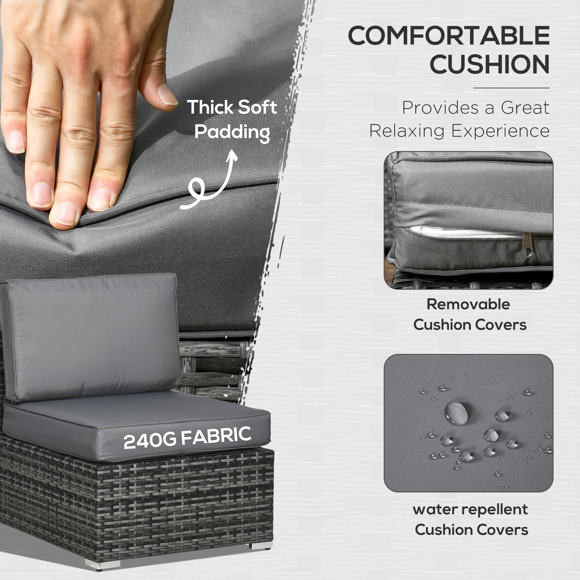 Make your garden stand out like never before. Say hello to this garden corner sofa set. Each piece has a steel frame for strong support, wrapped in plastic wicker for double the durability; also creating a forever-stylish set for your outdoor space. Comes with two corner seats, four normal seats, a footstool and table - set up into a shape which you want. Padded cushions for comfort, with four coloured cushions for a touch of bold beauty.