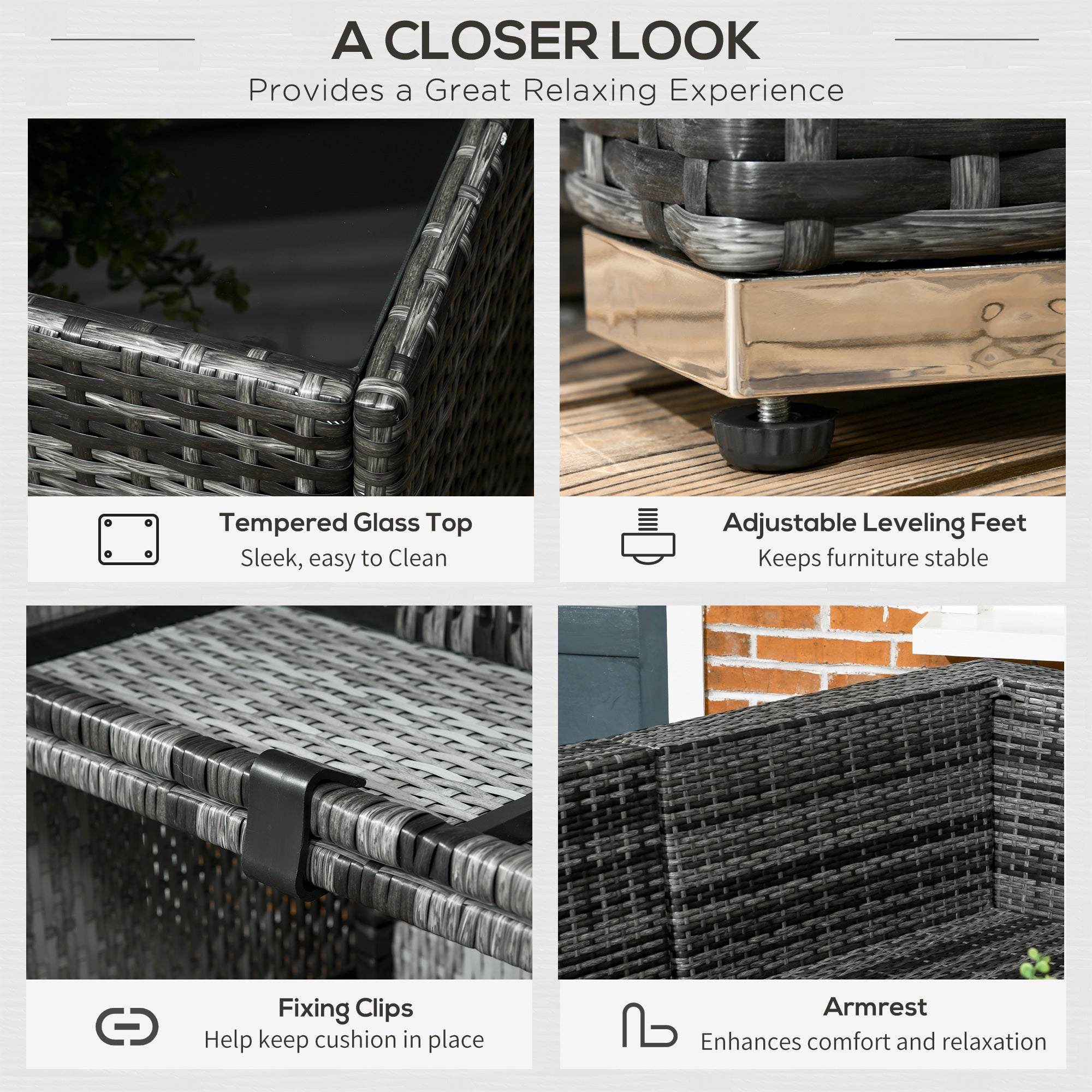 Material Used: PE rattan, Steel frame, Tempered glass