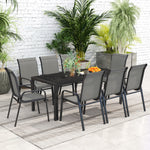 Transform your garden into a stylish dining oasis with the 8 seater garden table and chairs. Featuring breathable mesh seat and back for quick-drying comfort and chairs that stack to save space. The tempered glass top is scratch-resistant, providing a sleek, modern look while being easy to clean and maintain. It offers durability, ensuring your furniture stays looking fresh and stylish for years to come. This outdoor furniture set is great for garden parties and family gatherings!