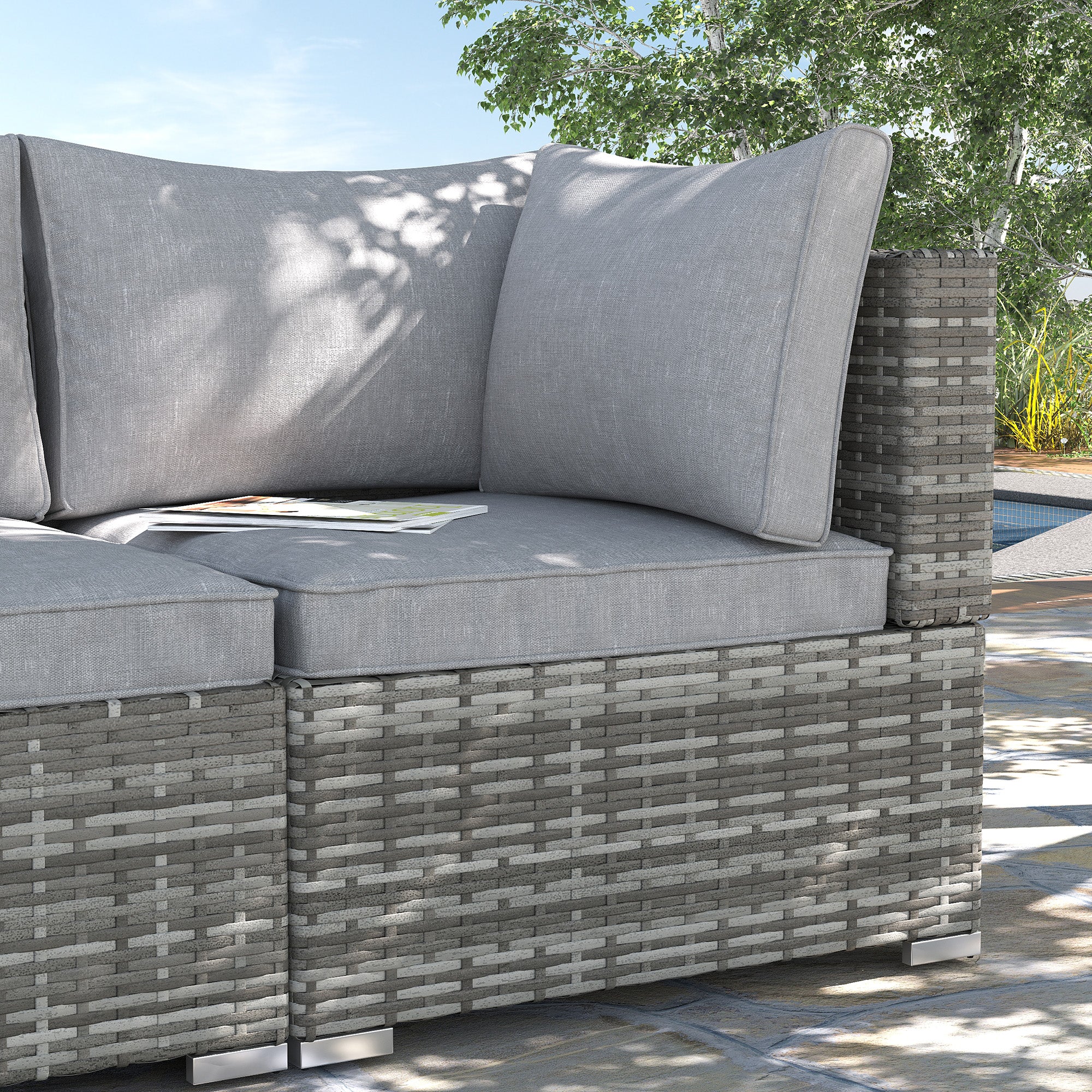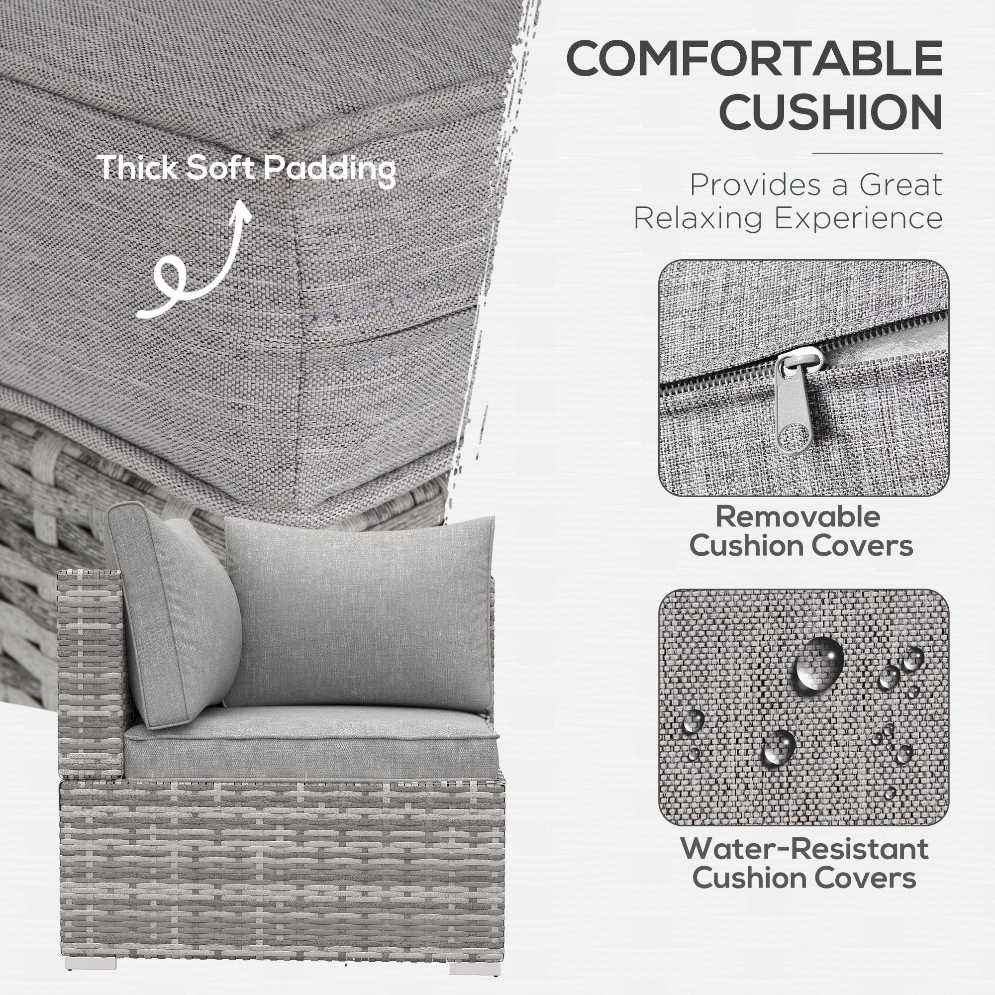 This modern rattan wicker corner sofa is must-have design. The core frame is made from galvanised metal, which is tough and rust-resistant for durability. It's wrapped with PE wicker for extra durability and suitability for outdoor use. Comes with a padded seat and two thick cushions for comfort - covers are removable and washable for hygiene. A great way to unwind in a cute and cosy spot outdoors with the sun on your face.