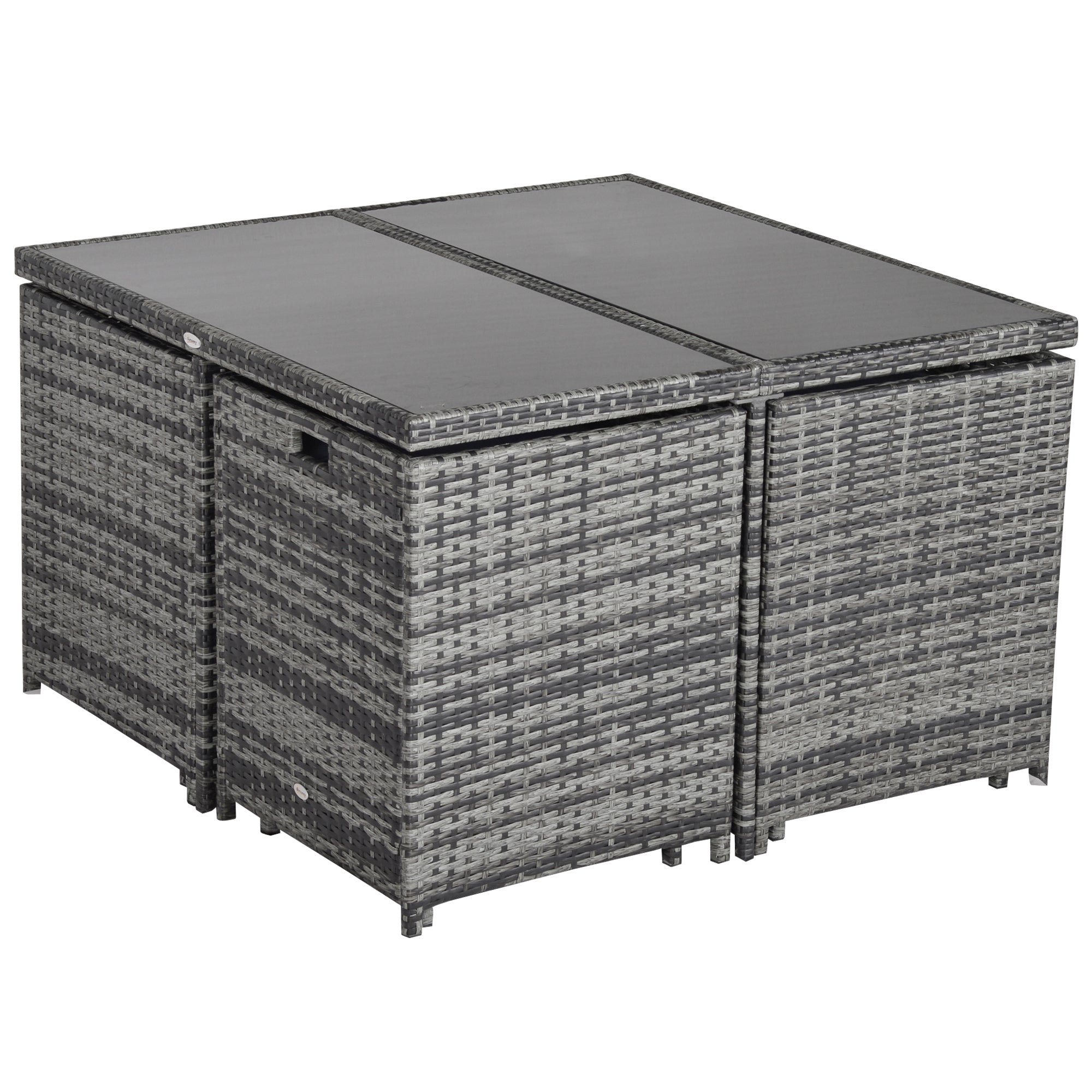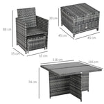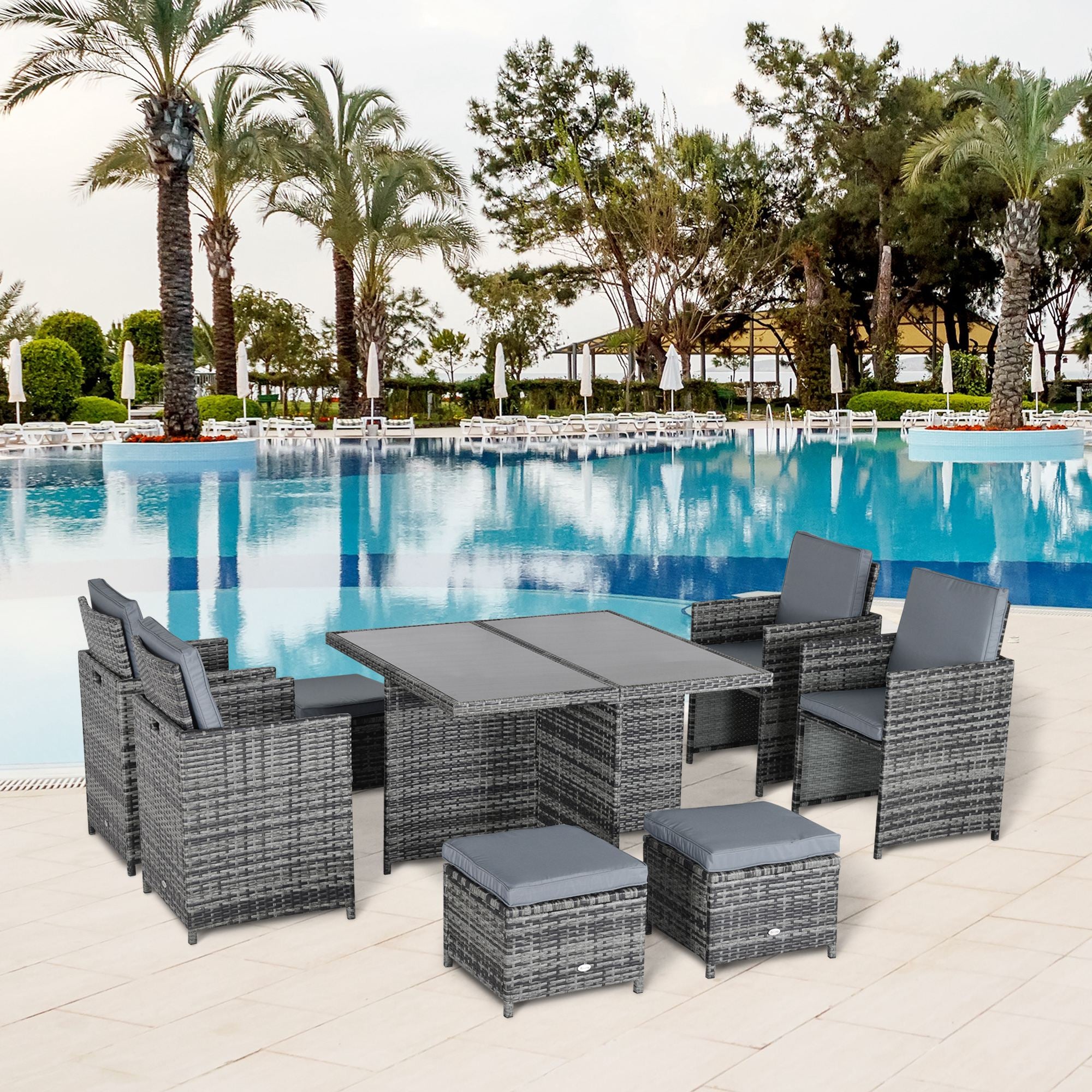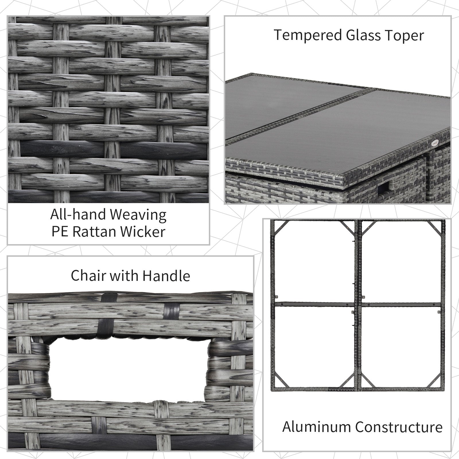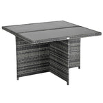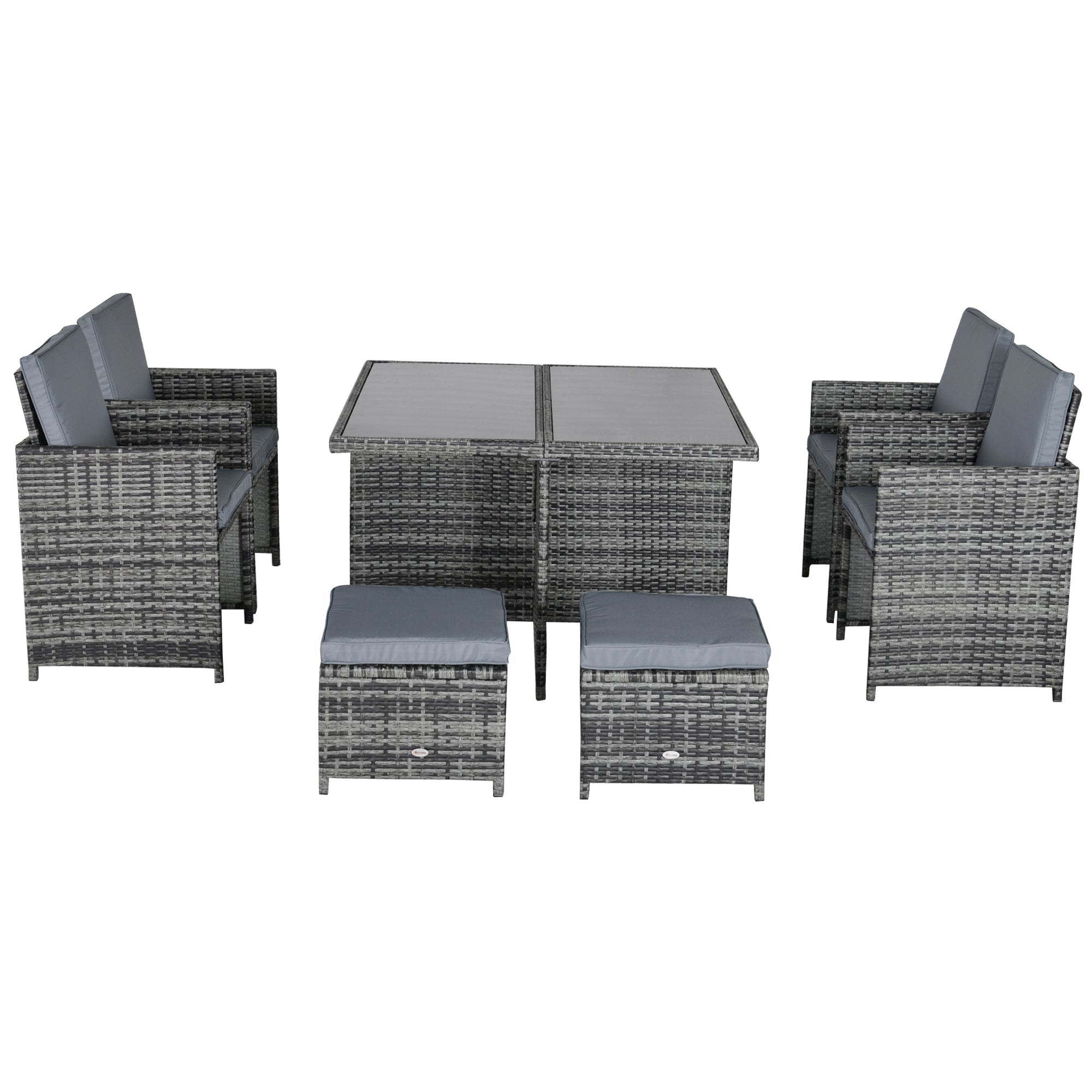 The 9-piece outdoor wicker dining set with cushions is suitable for any occasion. The elegant rattan dining set includes 1 table, 4 armchairs and 4 footrests made of aluminium frame and PE rattan. The wicker and tempered glass table combination looks fashionable and create a modern style for your living area.