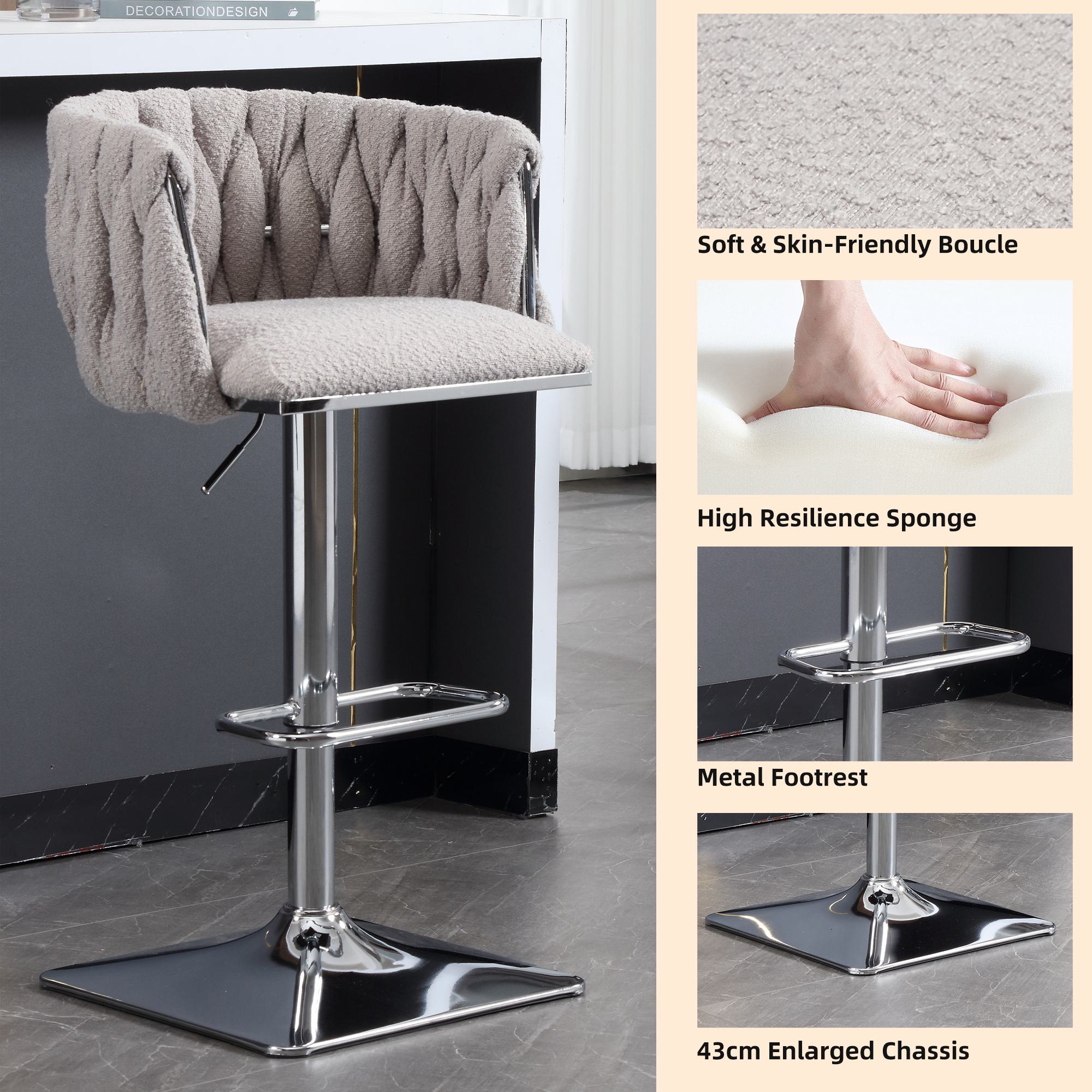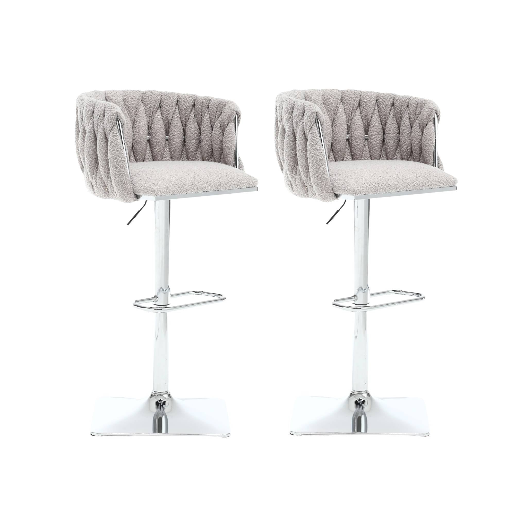 Adjustable Bar Stools Set of 2 with Woven Backs and Silver Base, Upholstered Boucle Fabric, for Kitchen Island and Pub, 53x51x87 cm, Gray