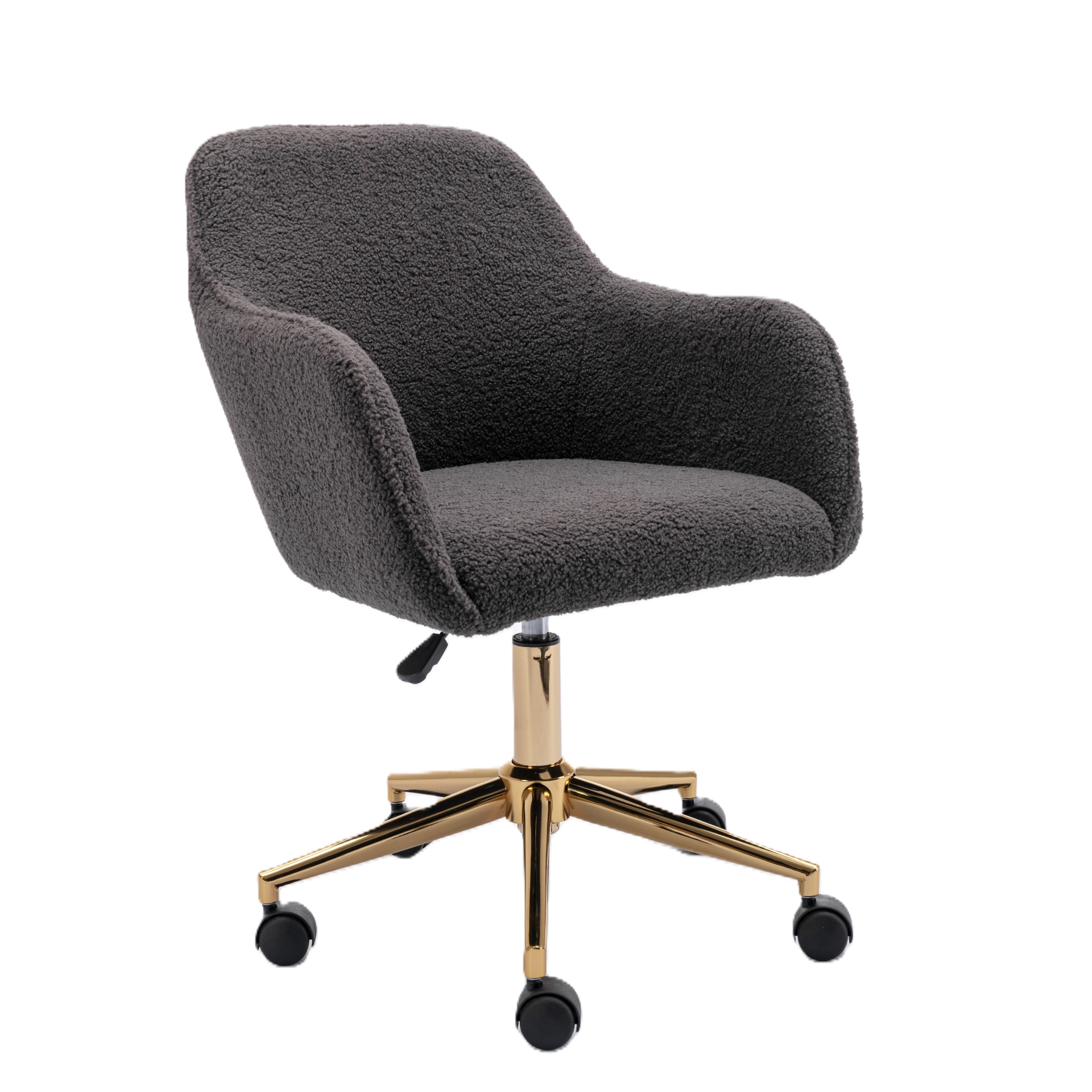 Elevate your workspace with the New Teddy Fabric Adjustable Height Swivel Home Office Chair, featuring luxurious dark grey velvet fabric and a chic gold metal base. Designed for comfort and style, this chair boasts an ergonomic backrest and 360° revolving universal wheels, making it perfect for any indoor office or bedroom. With an adjustable height range of 9cm, it can easily fit under most desks, and its sturdy construction supports up to 100kg. Easy to assemble in just 10 minutes, this chair combines functionality with a touch of elegance.