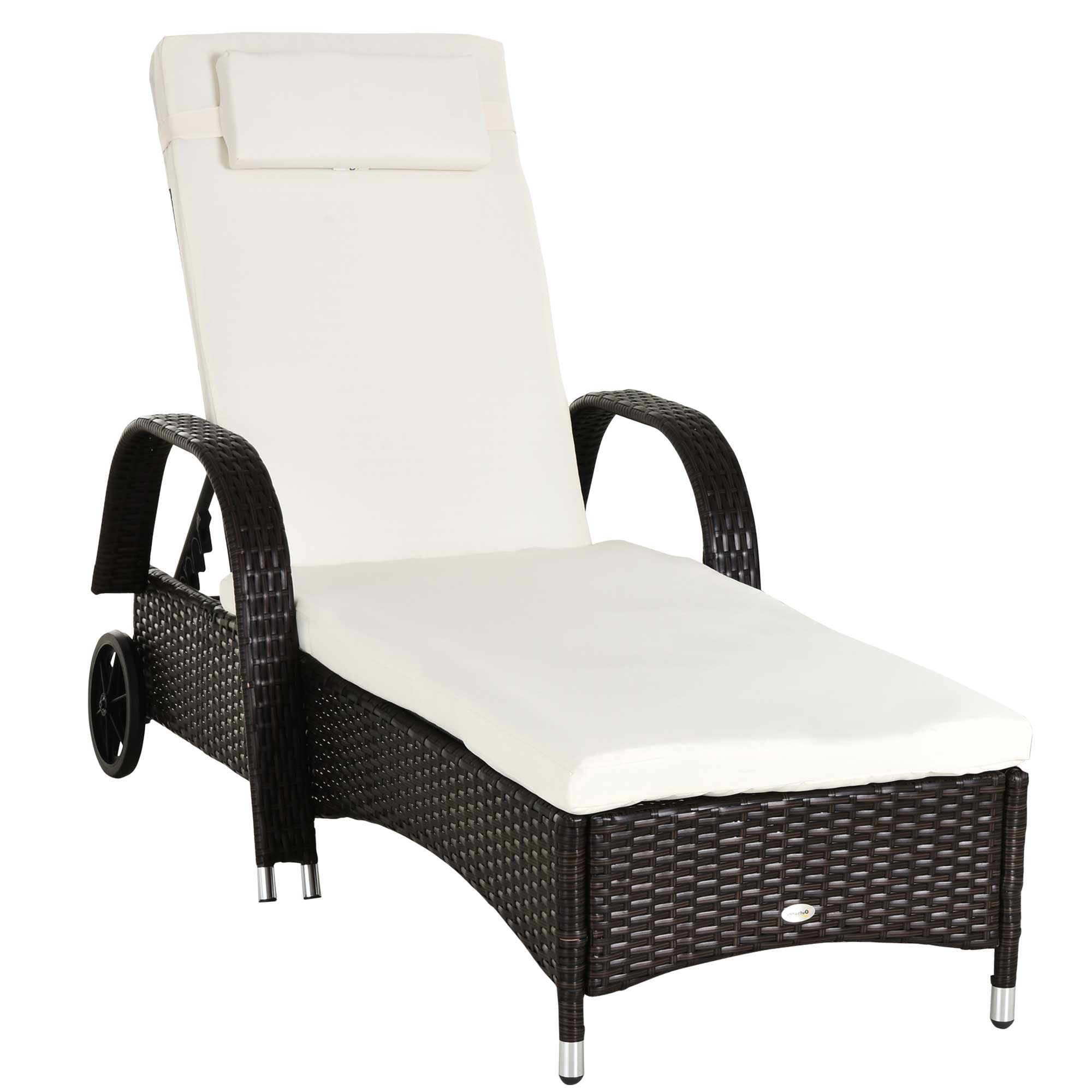 Soak up the sun with this Rattan Lounger. Made from weather-resistant PE wicker, with a strong steel frame underneath, the base is extremely sturdy and will provide you with many years of relaxation outside. On the top there is a thick foam cushion seat with a removable headrest for comfort and the back can be adjusted five different levels to suit your preferences. It is finished with two wheels to you can move it easily, whenever you wish.