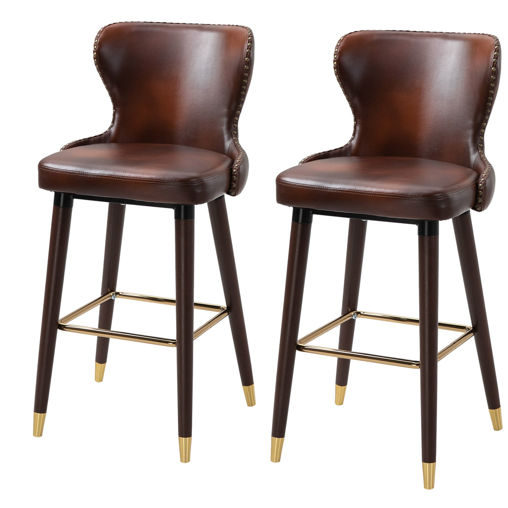 Bar Stools Set of 2, PU Leather Vintage Counter-Height Bar Chair, Luxury European Style Kitchen Stools with Back, Brown