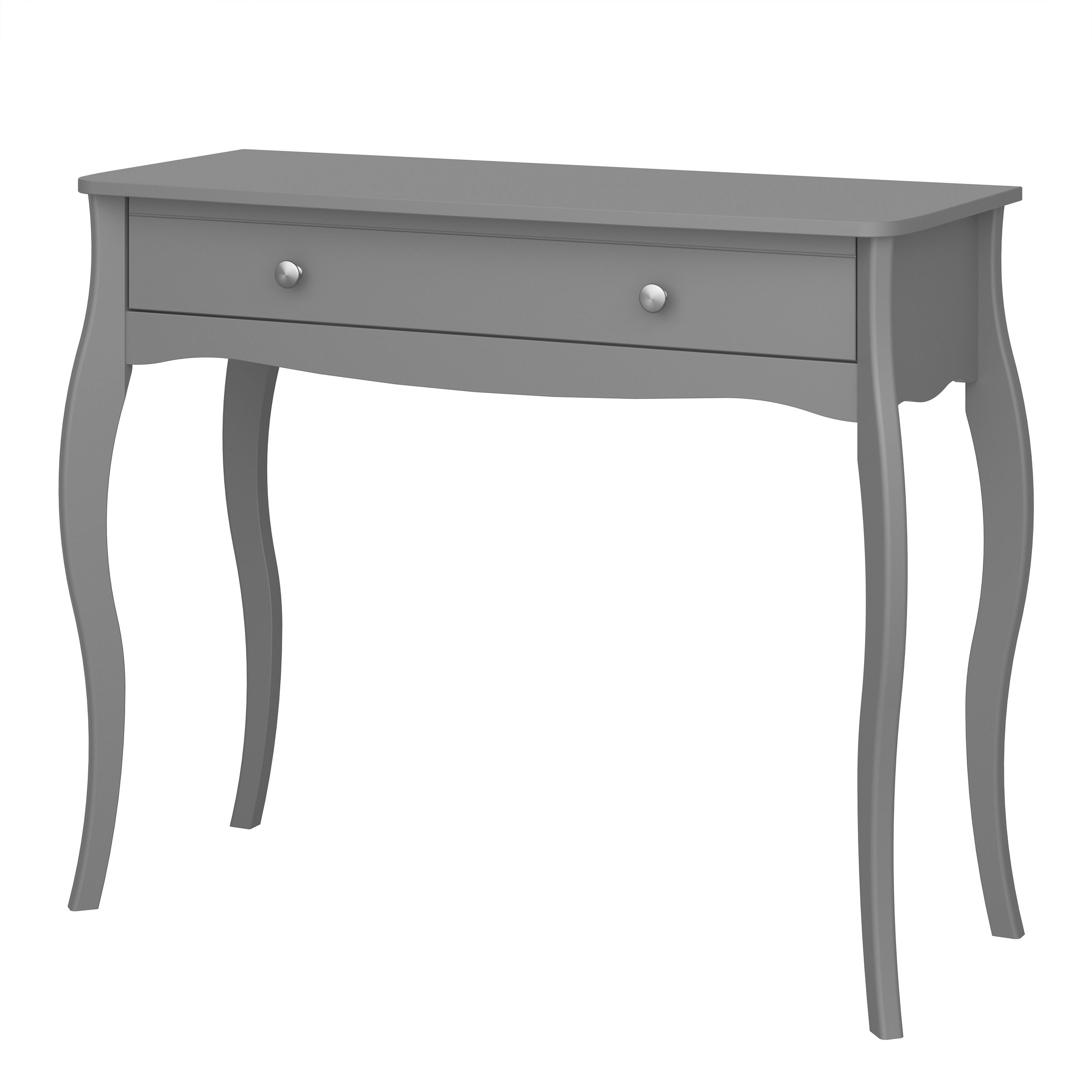 This Provence-inspired Baroque Dressing Table brings a touch of elegance to any bedroom. With delicate detailing, grey finish and stainless steel handles, this piece works well with any style of room. The single drawer offers great storage space for makeup, jewellery or other such items, helping to keep them organised and within easy reach. The Dressing Table is best matched with the Baroque Dressing Table Stool and Mirror.