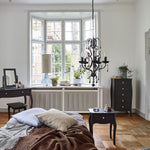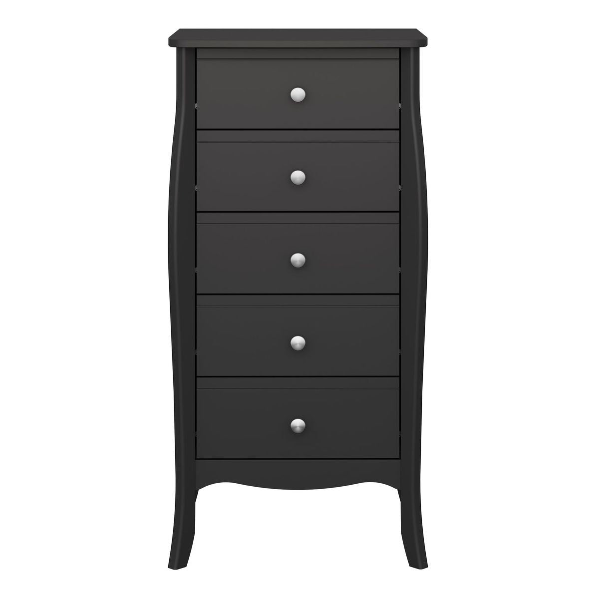 This Provence-inspired Baroque narrow chest brings a touch of elegance to any bedroom. With delicate detailing, rich black finish and stainless steel handles, this piece works well with any style of room. This classic chest offers 5 drawers of storage space with a compact footprint, making it ideal for any size of room.