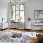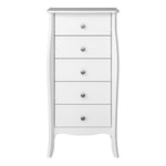 This Provence-inspired Baroque narrow chest brings a touch of elegance to any bedroom. With delicate detailing, crisp white finish and stainless steel handles, this piece works well with any style of room. This classic chest offers 5 drawers of storage space with a compact footprint, making it ideal for any size of room.