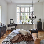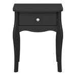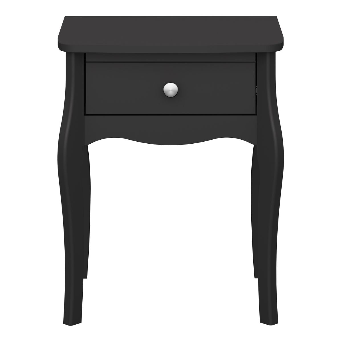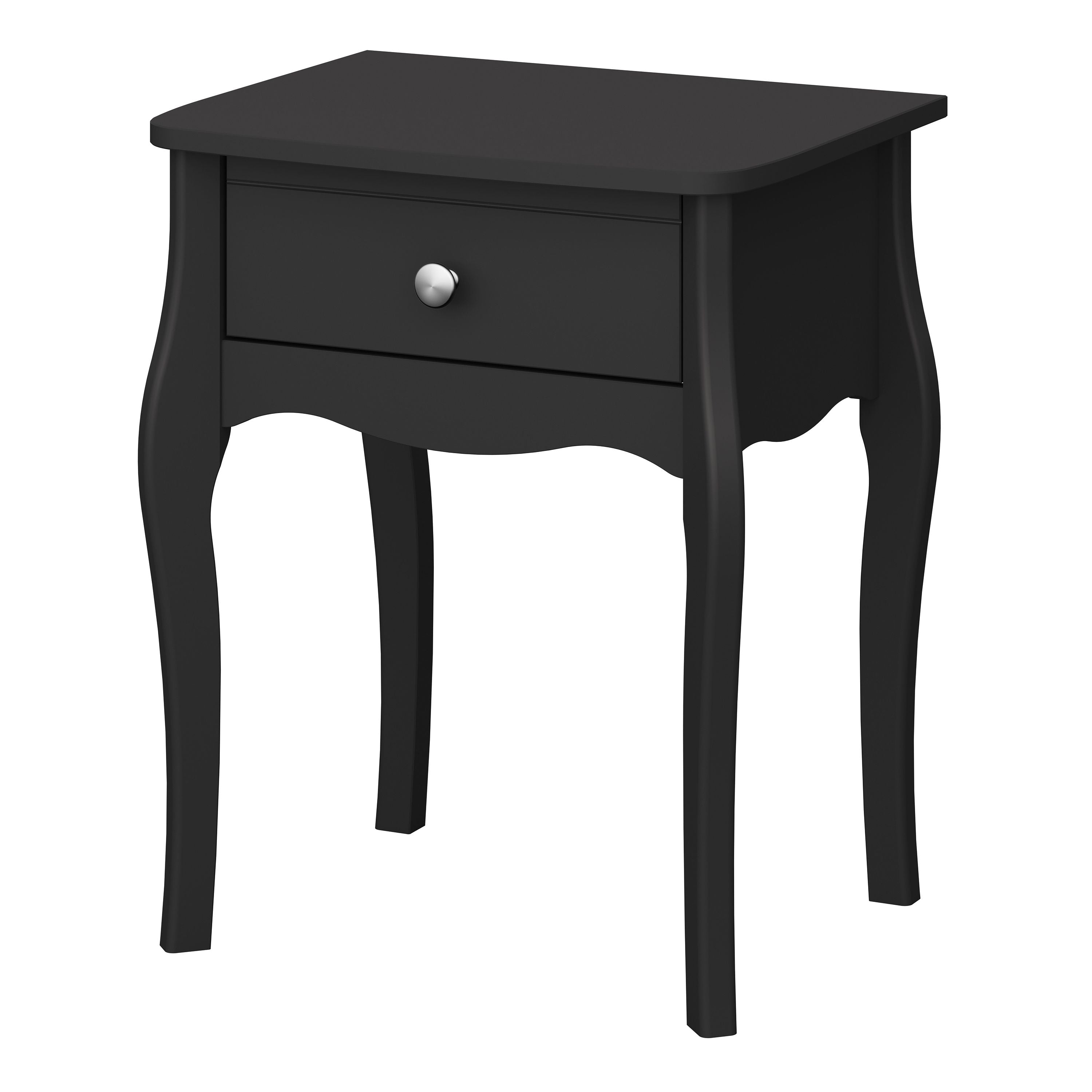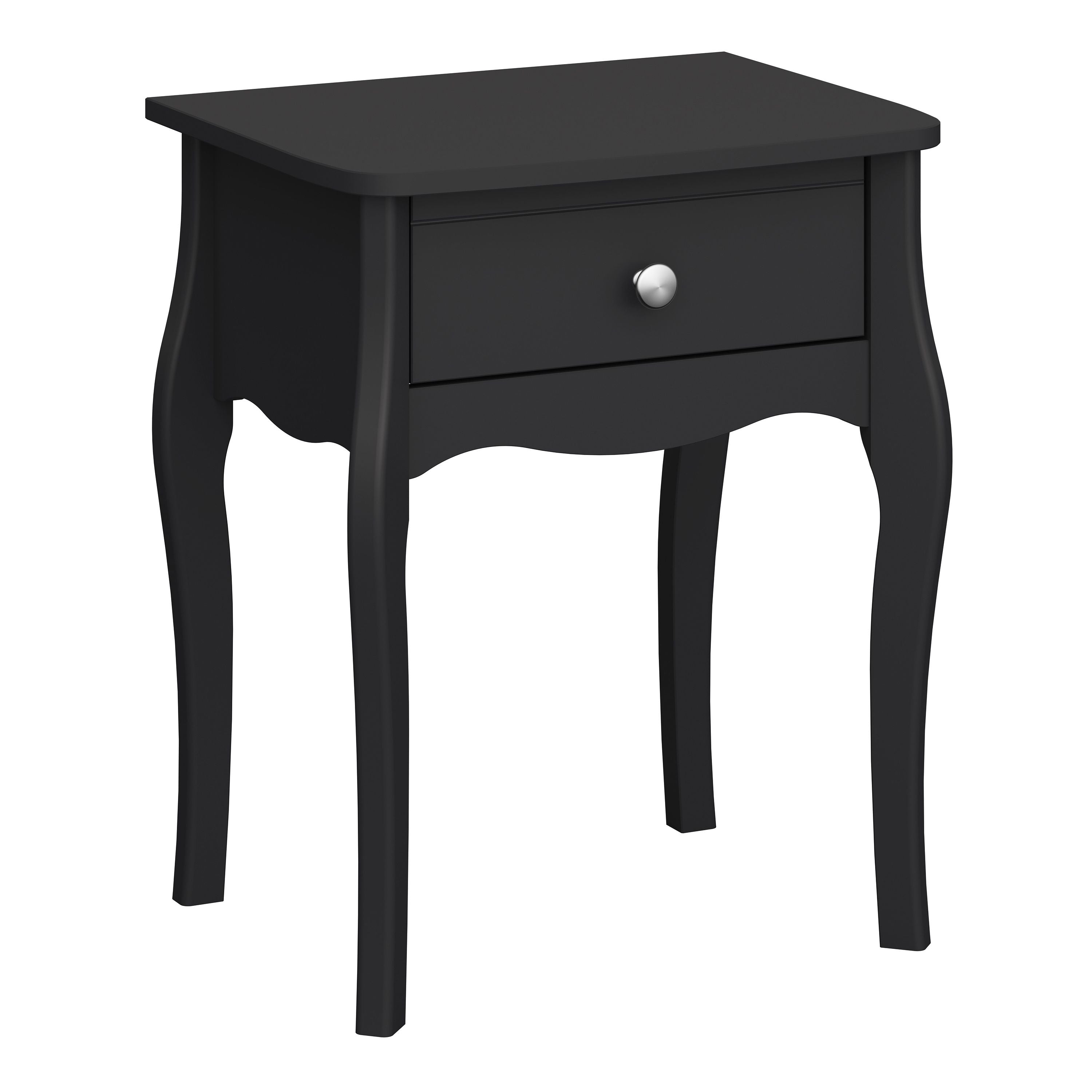 This Provence-inspired Baroque Bedside Table brings a touch of elegance to any bedroom. With delicate detailing, rich black finish and stainless steel handles, this piece works well with any style of room. This classic bedside cabinet offers a drawer and an open cabinet for ample storage, ideal for keeping your sleeping space uncluttered.