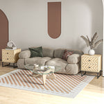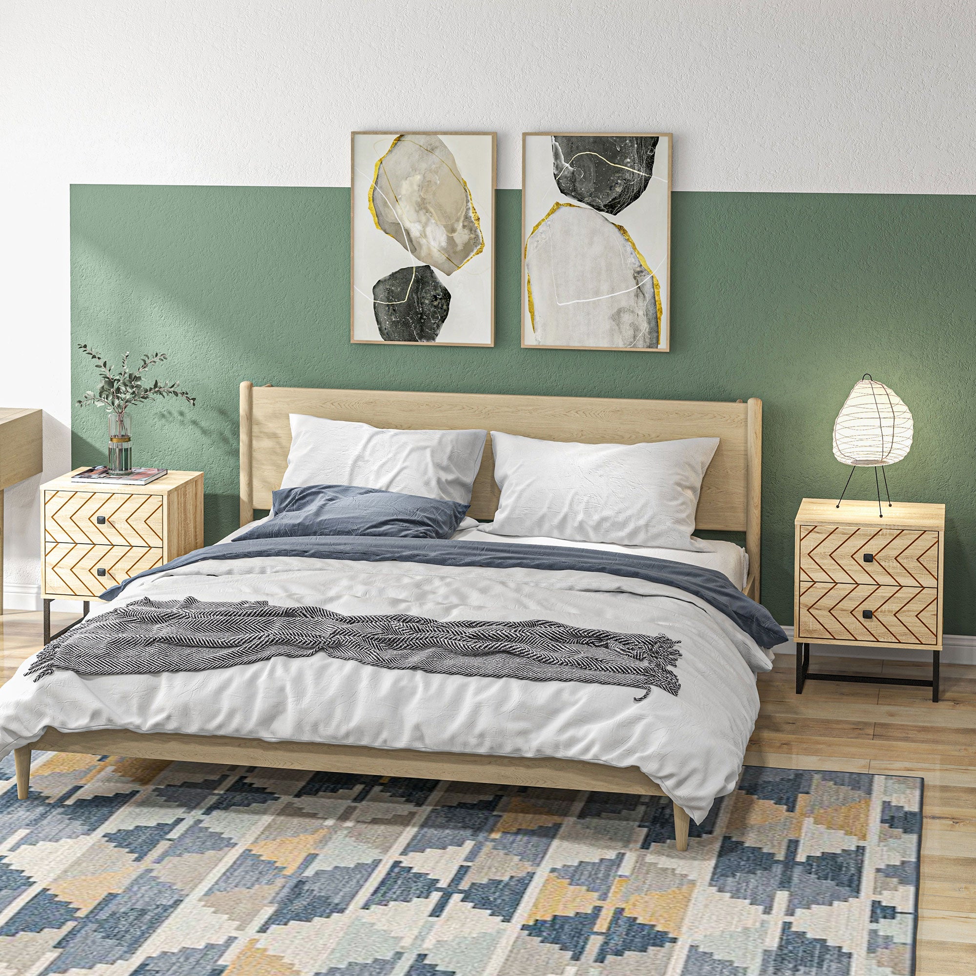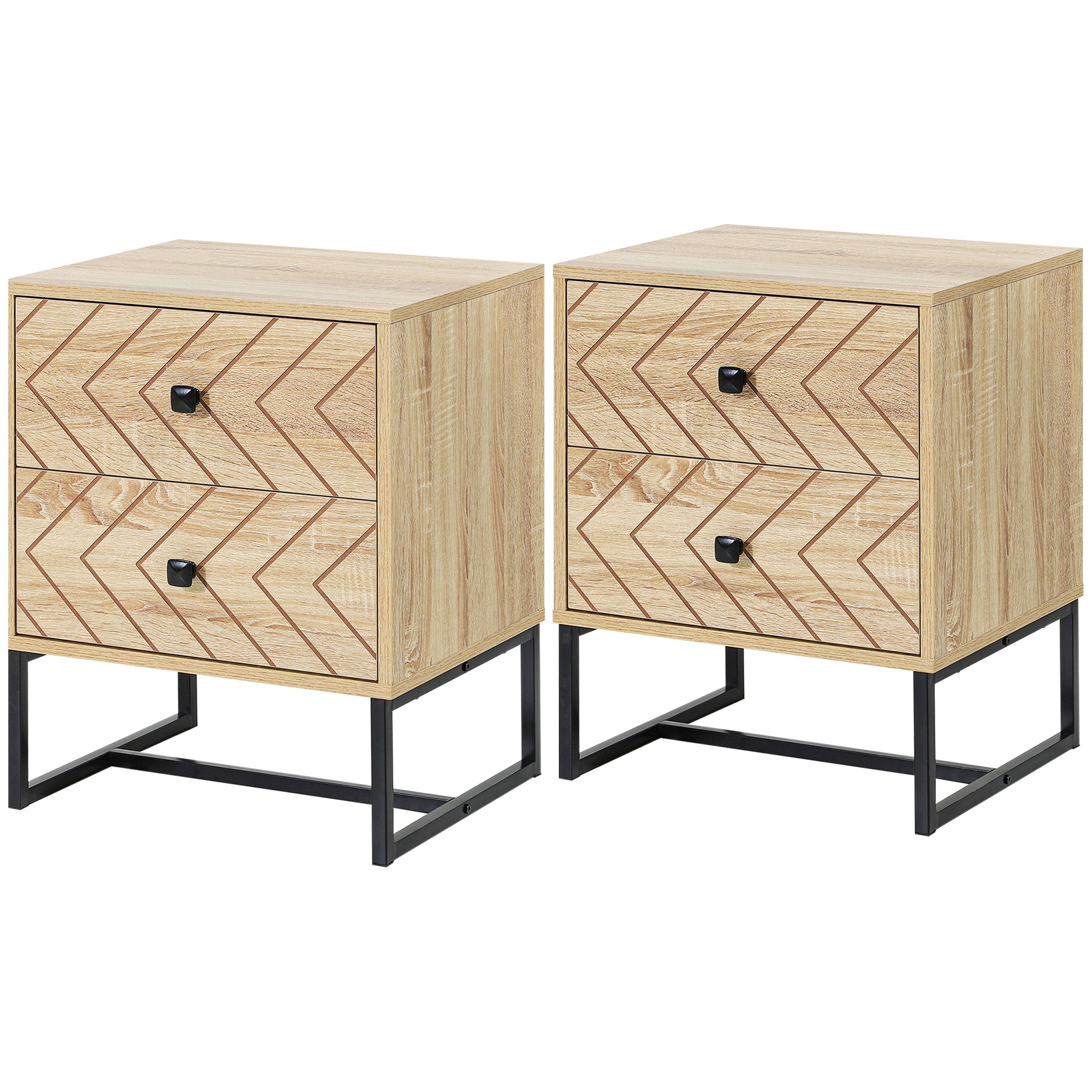 Bedside Table Nightstand Two-Drawer Bedroom Storage Unit Zig Zag Design with Black Metal Handles, Set of 2, Natural