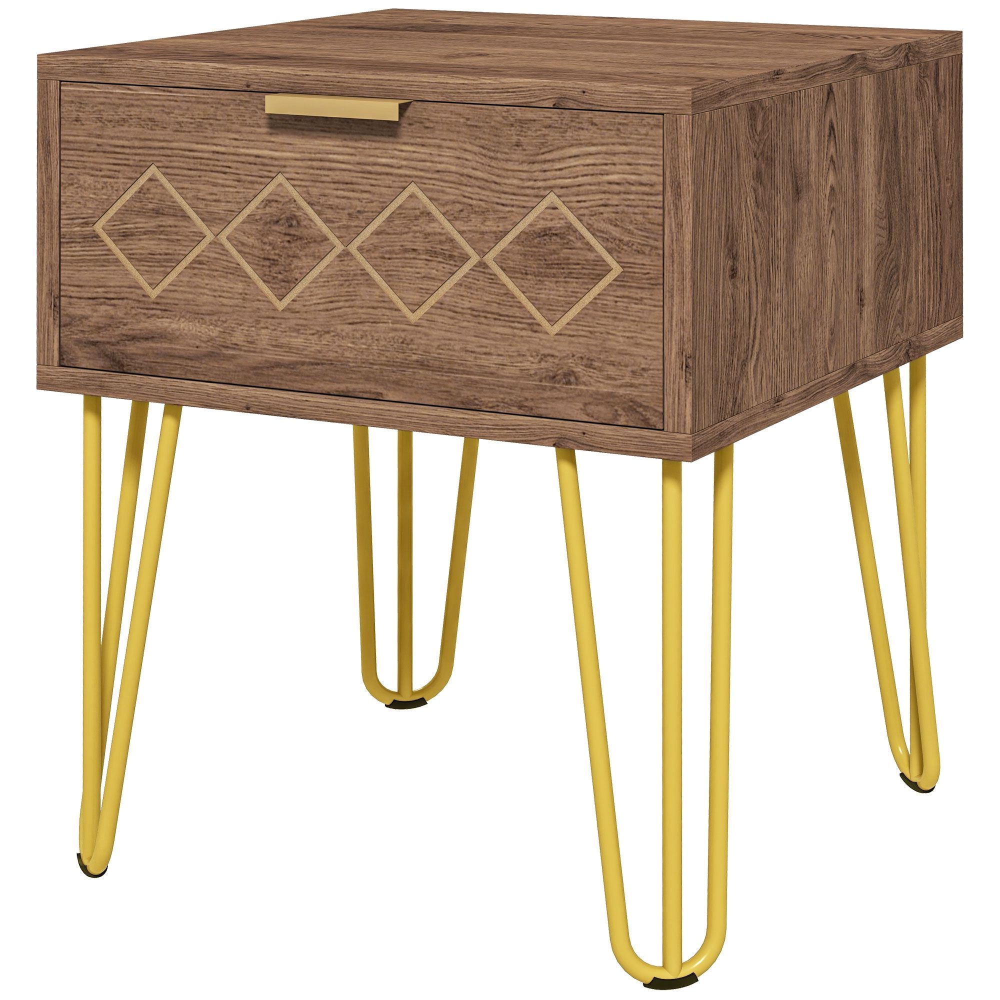 Fusing the classic with the glam, this bedside table. The somewhat faded wood-effect finish is complemented with gold coloured accents to elevate the look. A boxy shape for modern-day styling, it comes with a large pull-out drawer, so you have a good amount of storage space. Four hairpin-shaped metal legs offer lots of support; the gold colour partners with the gold-tone handle and diamond-pattern details on the drawer for a complementary finish.