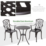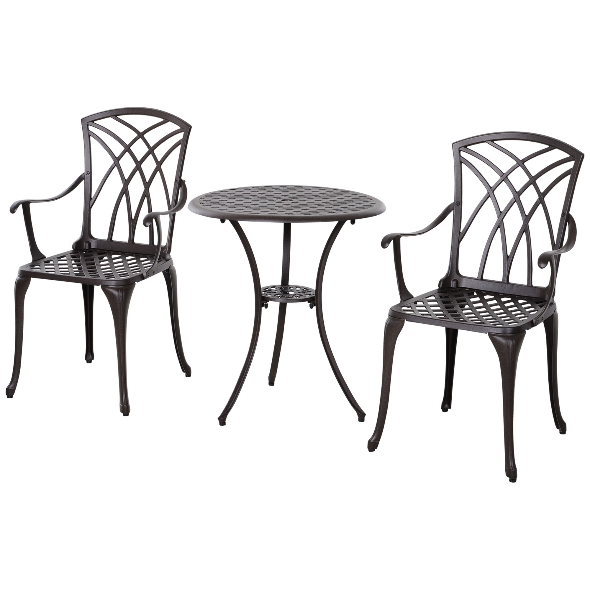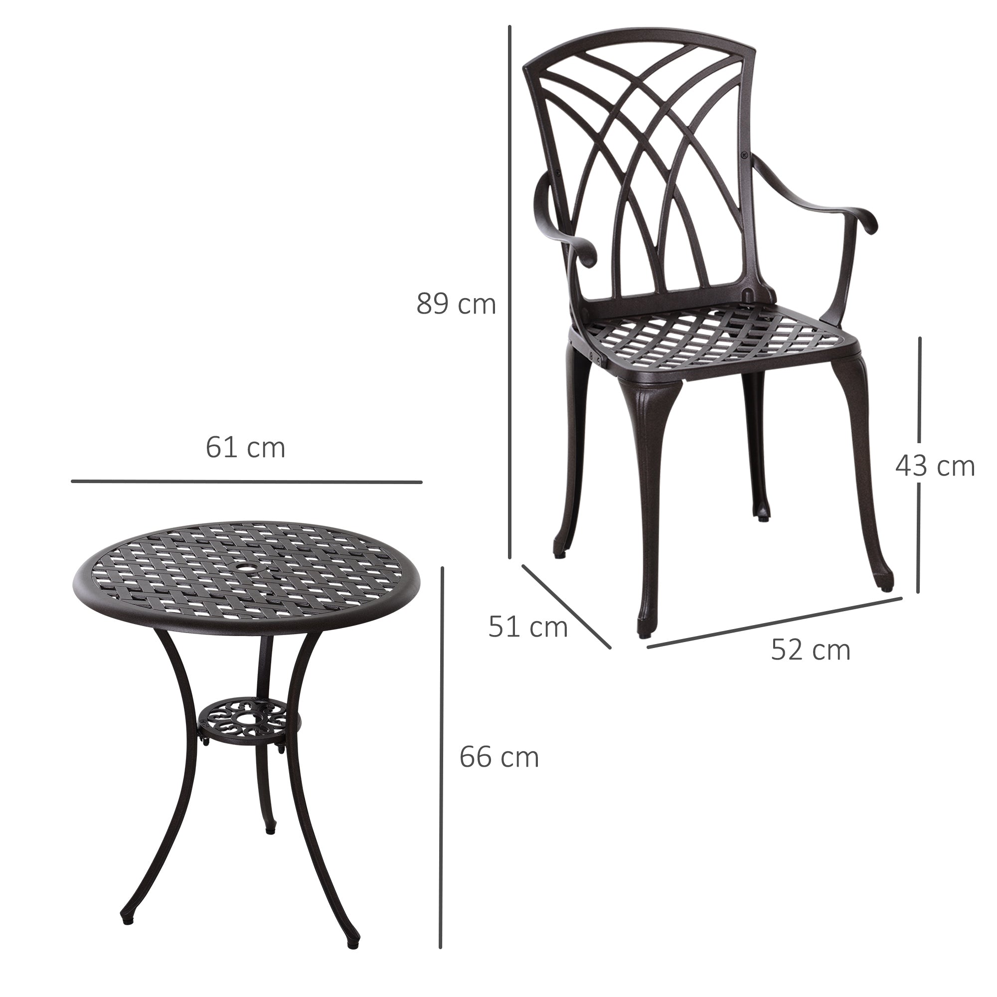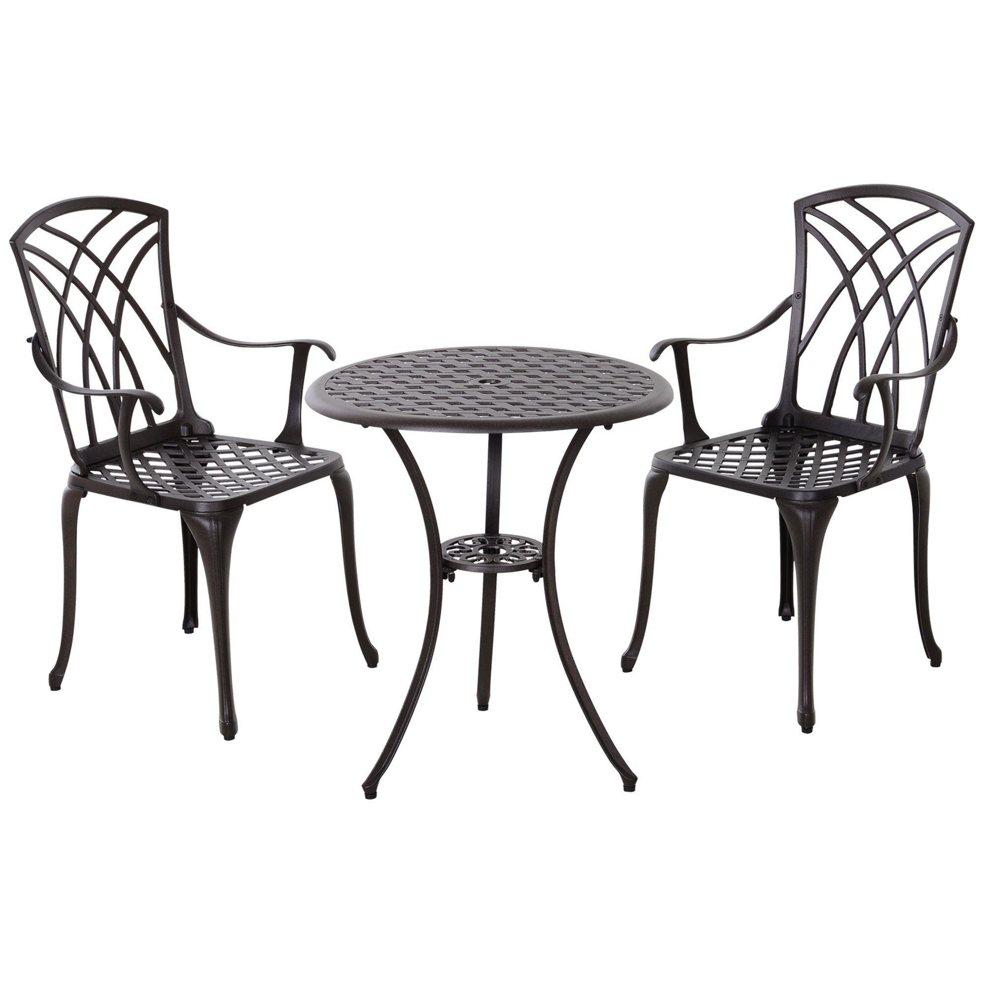 3 Pieces Garden Dining Set for 2, Cast Aluminium Outdoor Dining Set with 2 Armchairs and Round Dining Table with Parasol Hole, Garden Furniture Set, Brown