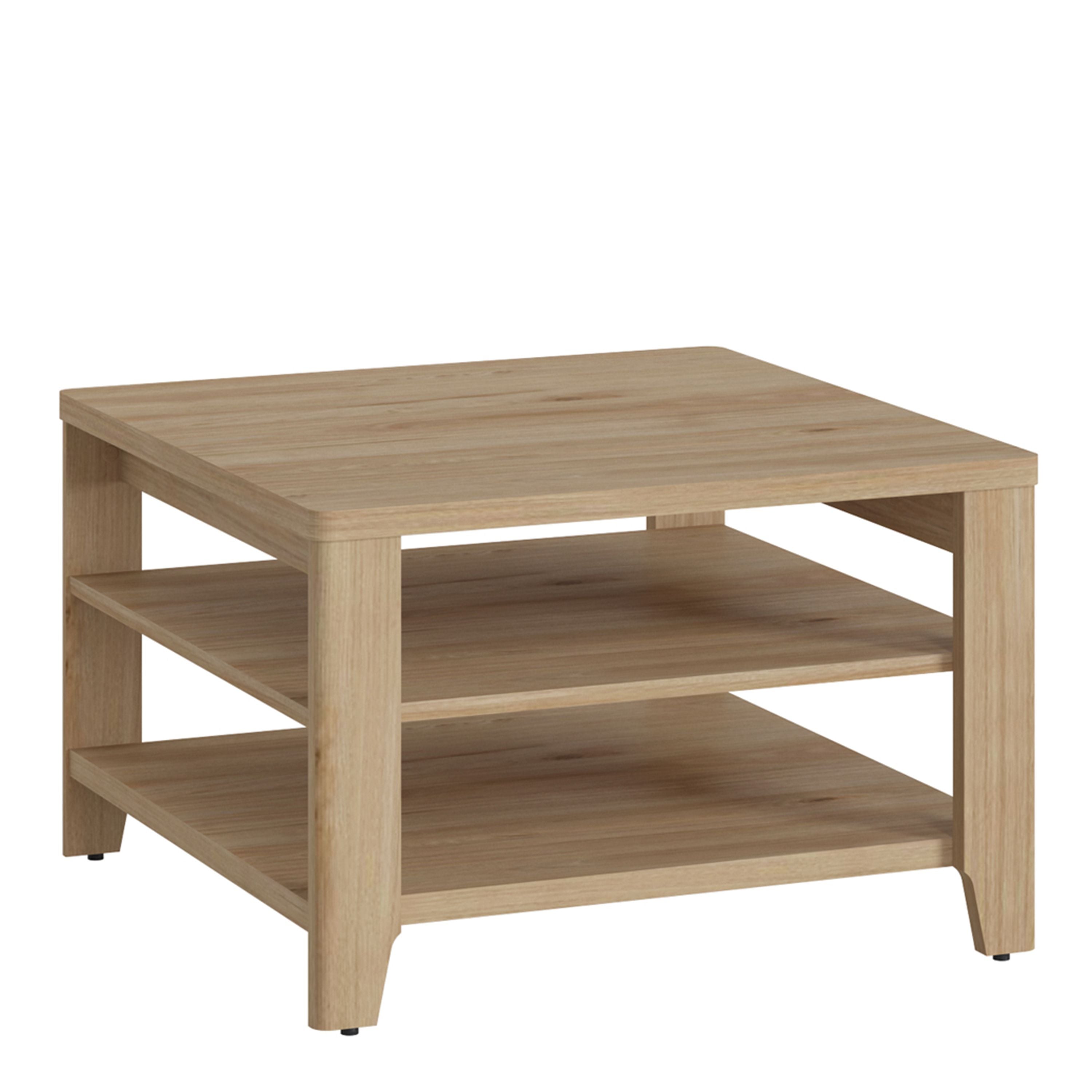 The coffee table with shelves under the countertop, available as part of the Cestino furniture collection, is perfect for the living room. The table, made of laminated chipboard, is available in the timelessly fashionable Jackson Hickory shade. This impressive piece of furniture, distinguished by its simplicity and versatility, has shelves for small items, placed under the table top.