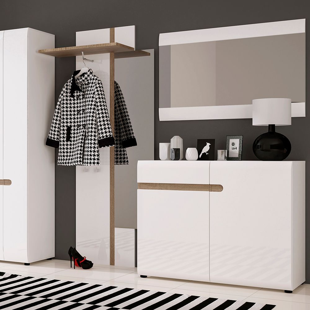 Unconventional design - a proposal for the followers of the latest trends. The clever mix of scratch resistant white melamine with beautiful high gloss fronts and oak melamine trim makes this top quality collection of furniture the ideal destination for the most modern of homes, the massive range that includes many cabinets and wall units fulfils every storage and display option.