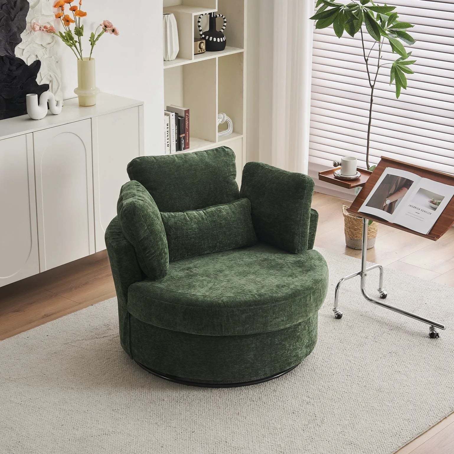 Elevate your living space with this luxurious Chenille swivel armchair, complete with three back cushion pillows and a crescent stool ottoman in a vibrant green hue. Crafted from soft chenille fabric, foam filling, and a sturdy wooden frame, this chair offers both comfort and durability. The black round swivel base allows for 360° rotation, making it perfect for any room, whether it's the living room, bedroom, or even a coffee shop. Easy to assemble in just 10 minutes, this stylish and versatile piece is designed to accommodate users aged 5 to 70 and supports up to 110kg.