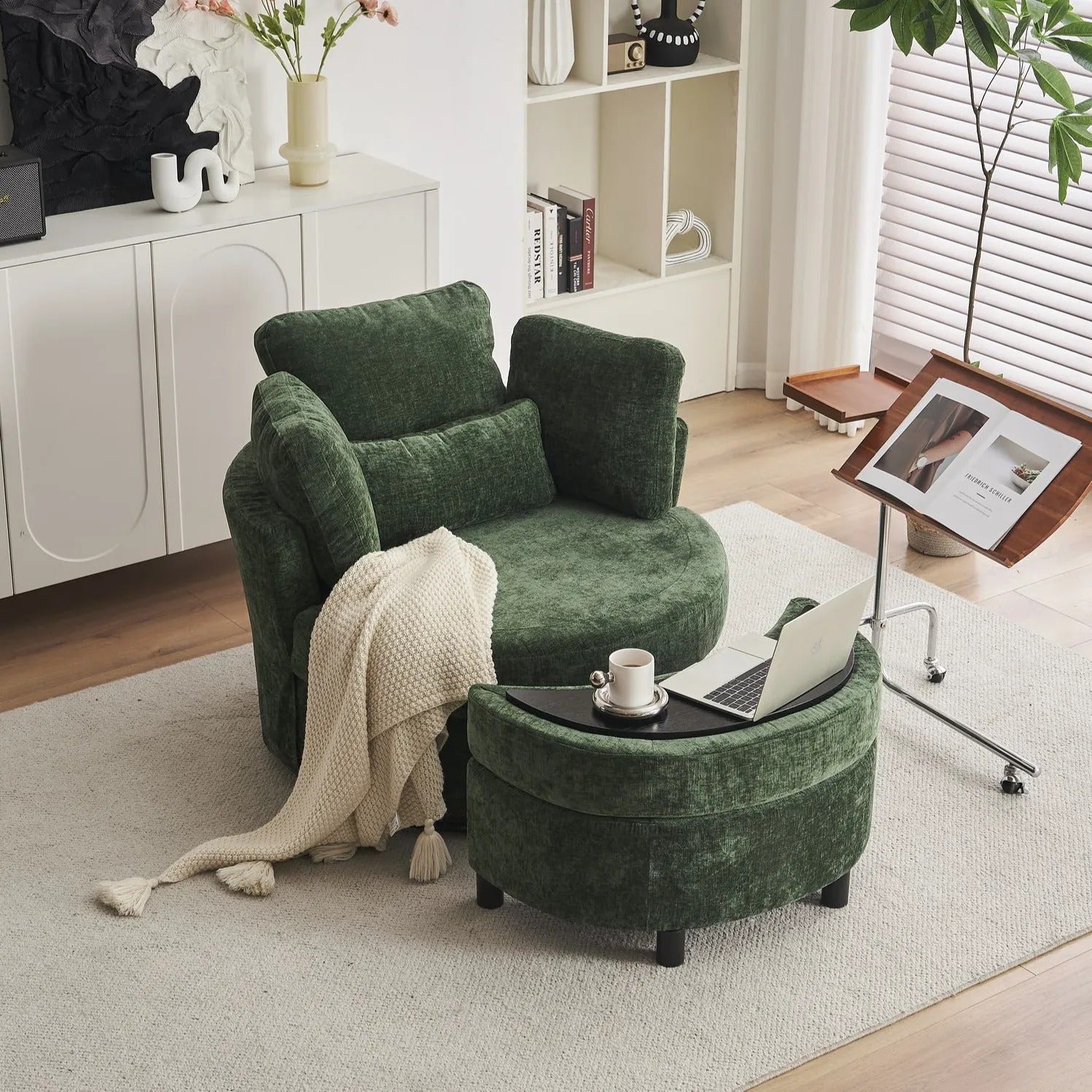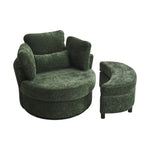 Chenille Swivel Armchair with 3 Back Cushions and Crescent Ottoman Stool, 360° Swivel Recliner Sofa, 107L x 105W x 82H cm, Green
