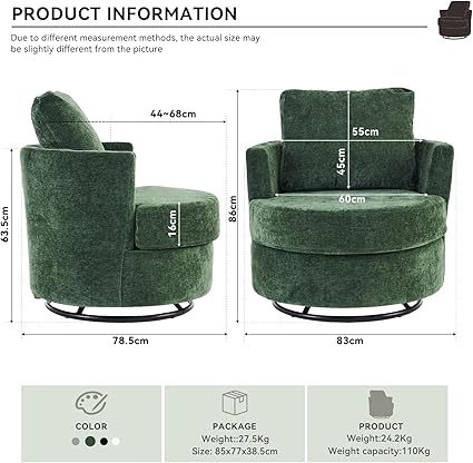 Material: Soft Chenille Fabric, Foam Filled, Wooden Frame, Black Round Swivel Base