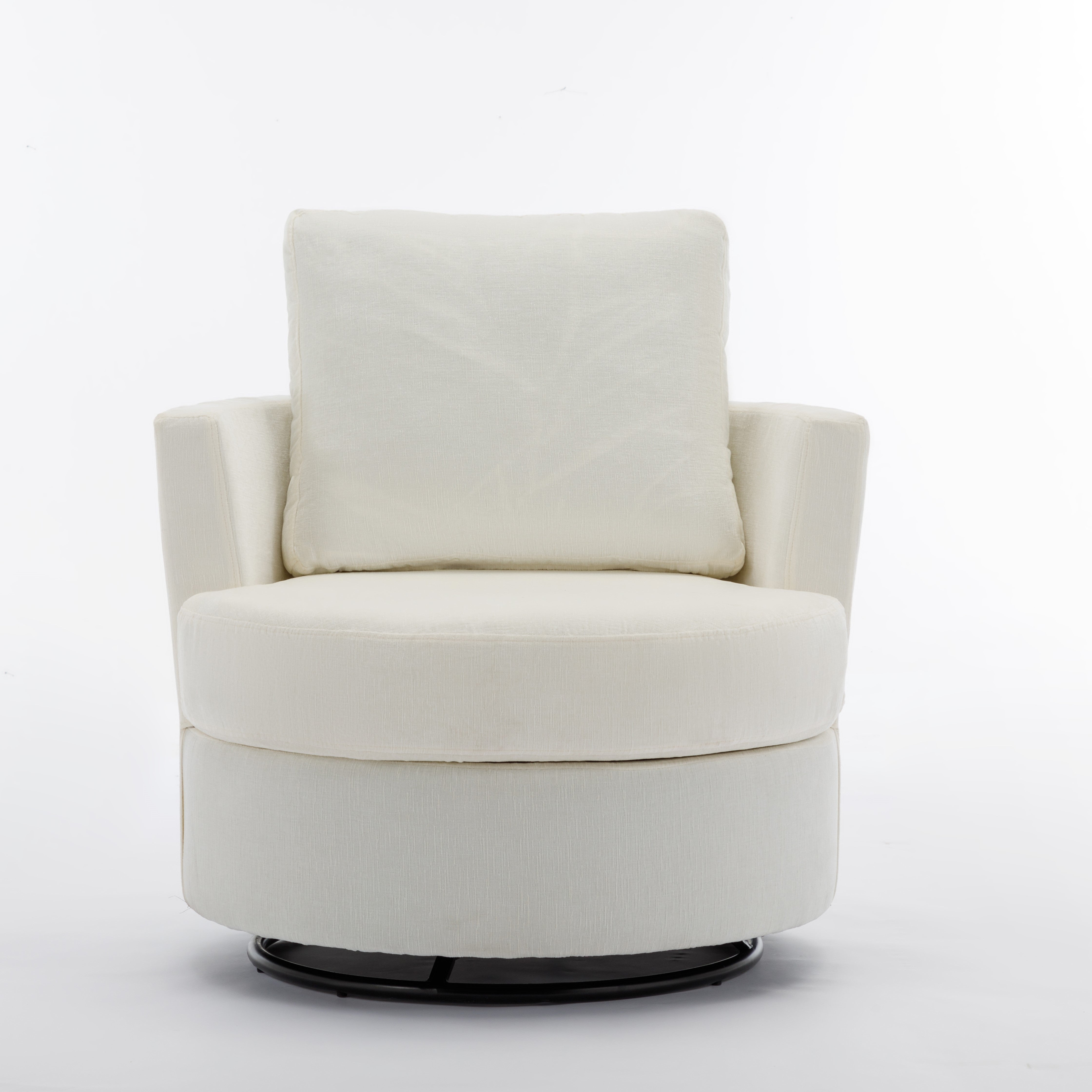 Material: Soft Chenille Fabric, Foam Filled, Wooden Frame, Black Round Swivel Base