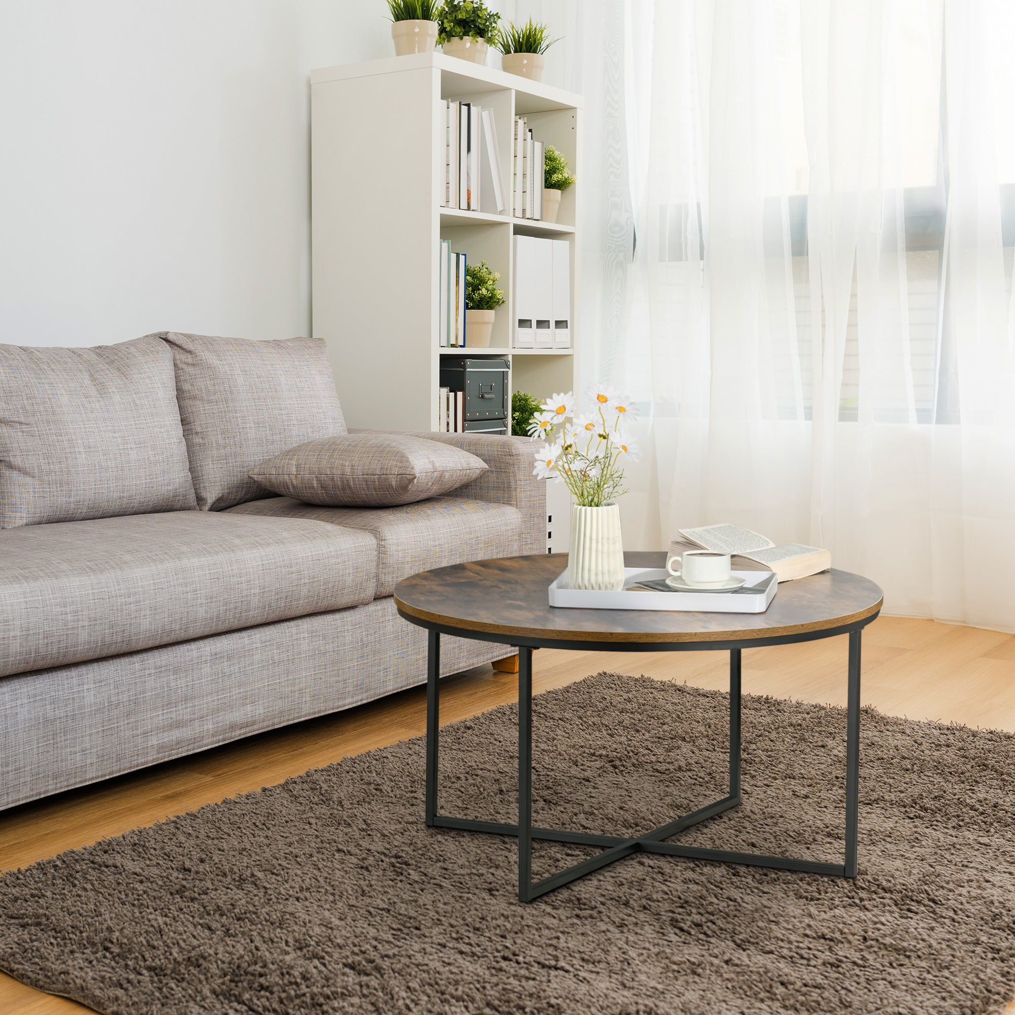 With its rustic brown tone, large round top and industrial base, you'll love inviting this round coffee table into your home for a sleek and contemporary look. The metal frame in a unique cross-over design for continual stability. Using particleboard for a solid surface, a melamine coating on the top gives it a smooth finish for easy cleaning. This low coffee table features a large tabletop, which offer large space. It's completed with adjustable footpads to protect your floor and keep stable.