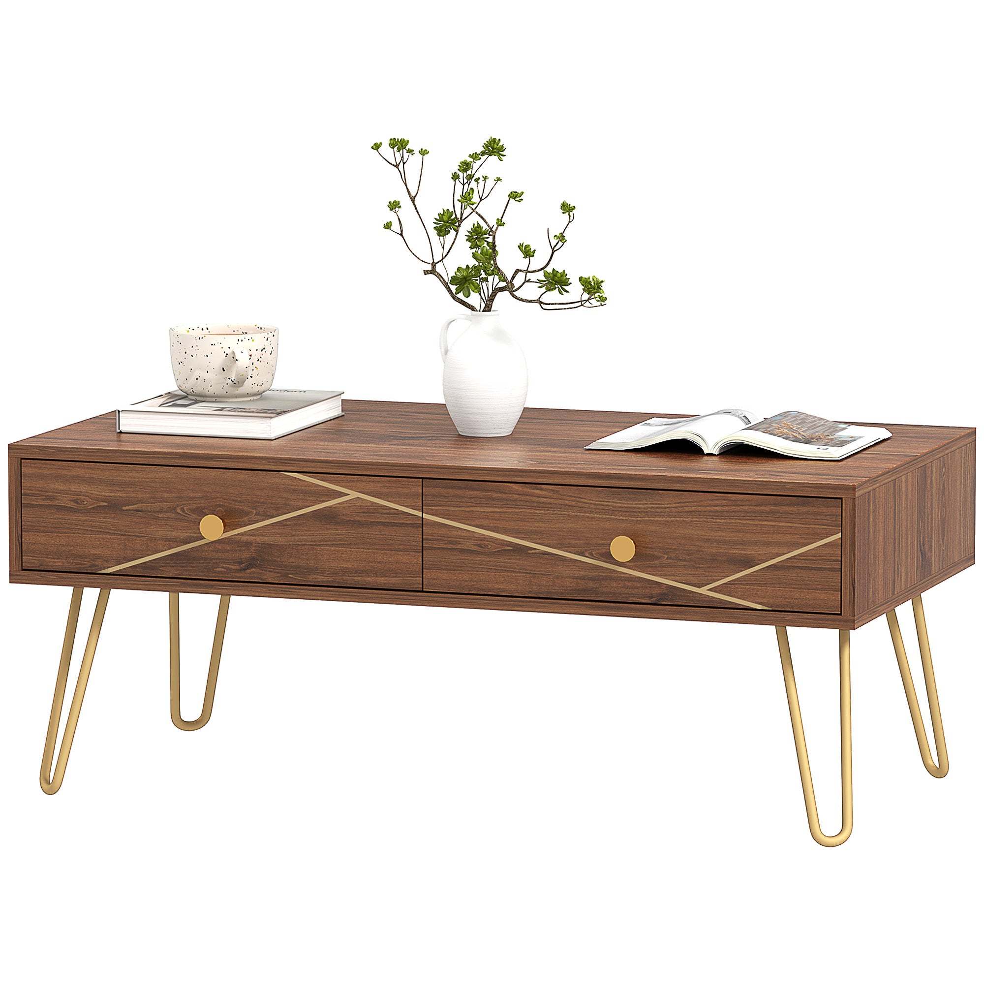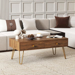 Elevate your lounge with the living room coffee table, where modern luxury meets practical design. Wood-effect panels adorned with golden lines knobs and chic hairpin legs create a stunning focal point. Featuring a handy tabletop and two drawers, this living room table for living room effortlessly combines style with functionality, making it a charming addition to any space.