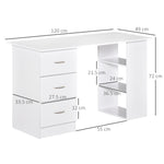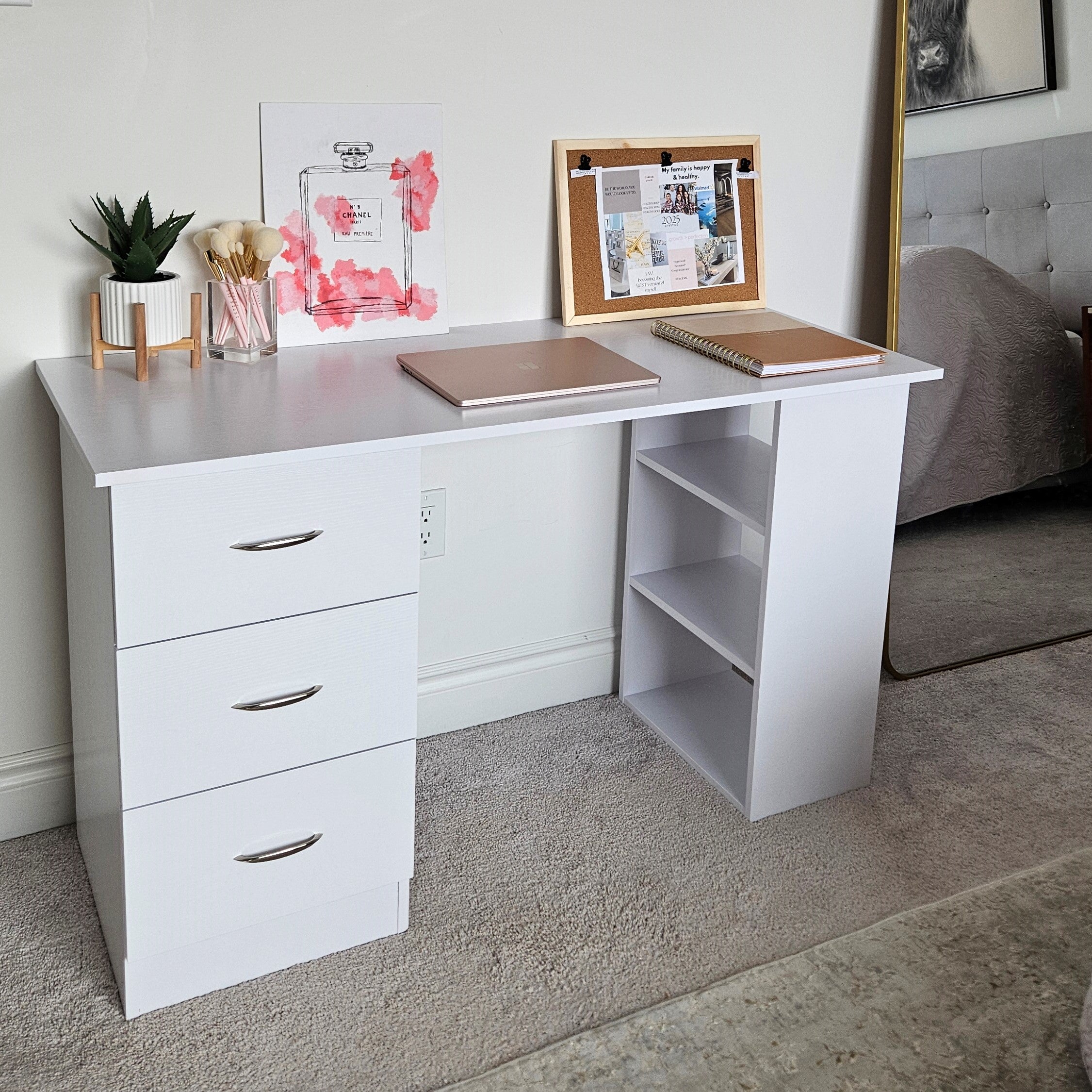 Computer Desk, Writing Table, PC Workstation with 3 Storage Shelves and Drawers, Silver Handle, for Home Office, White