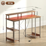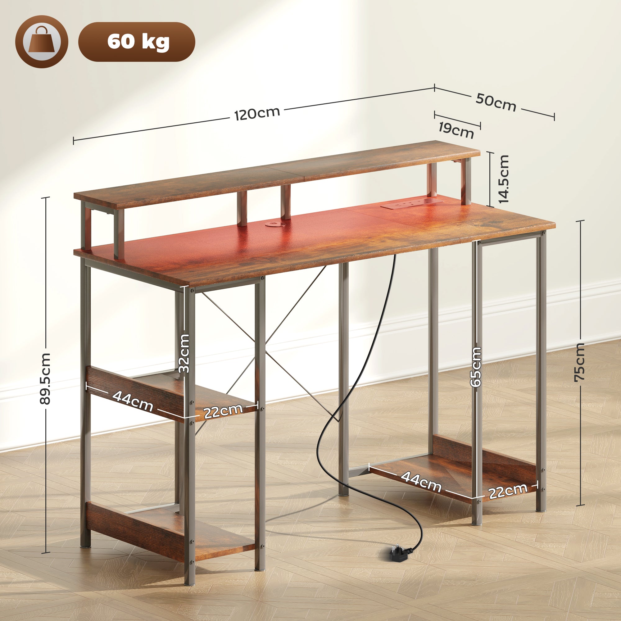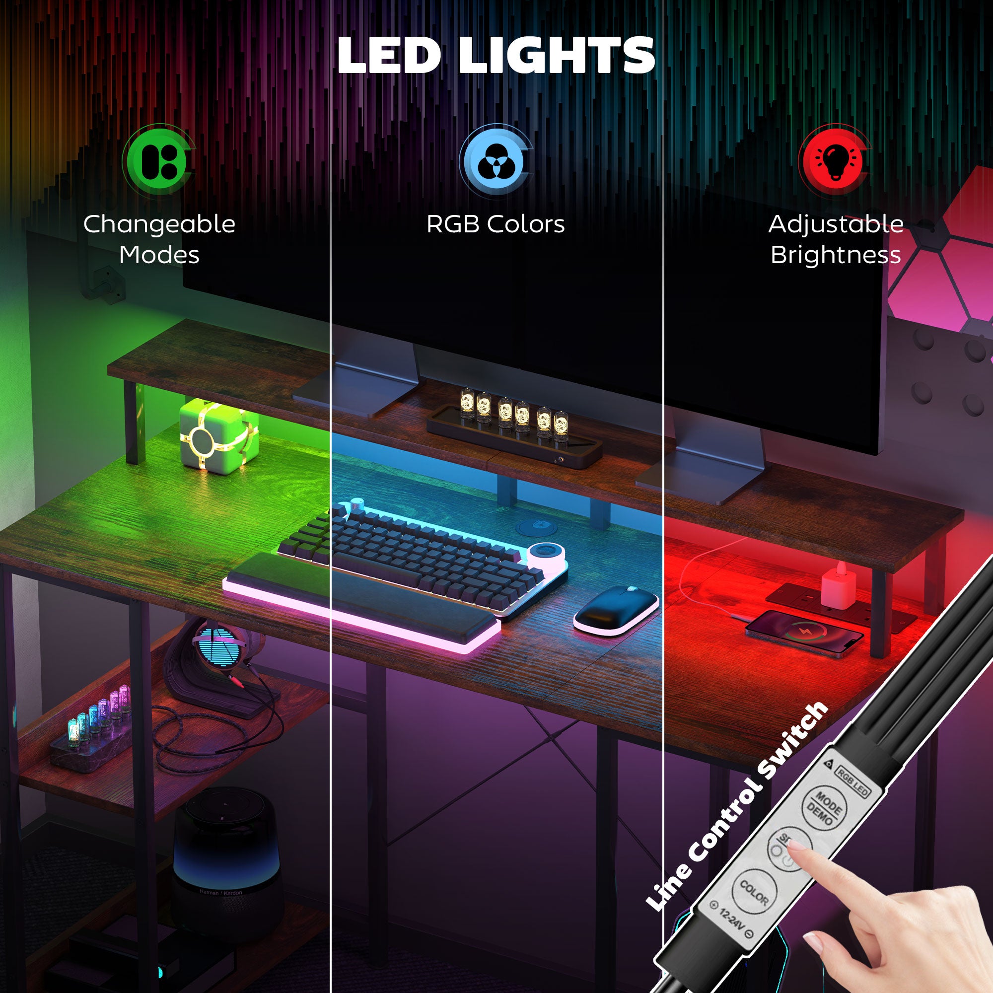 Computer Desk with Outlets and LED Lights, 120 x 50cm Reversible Home Office Desk with Monitor Stand and 2-Tier Storage Shelves, Gaming Desk with Cable Management, Rustic Brown