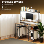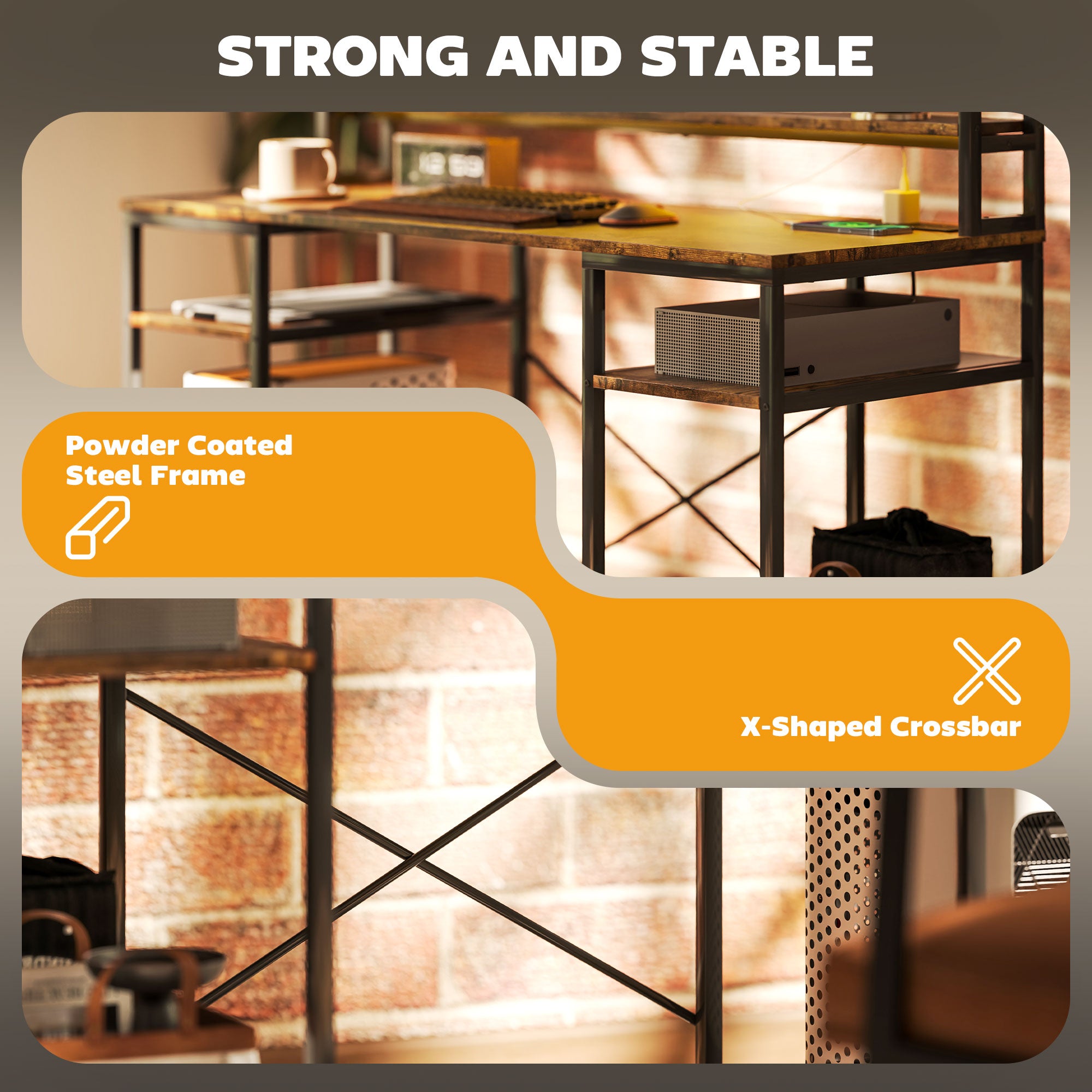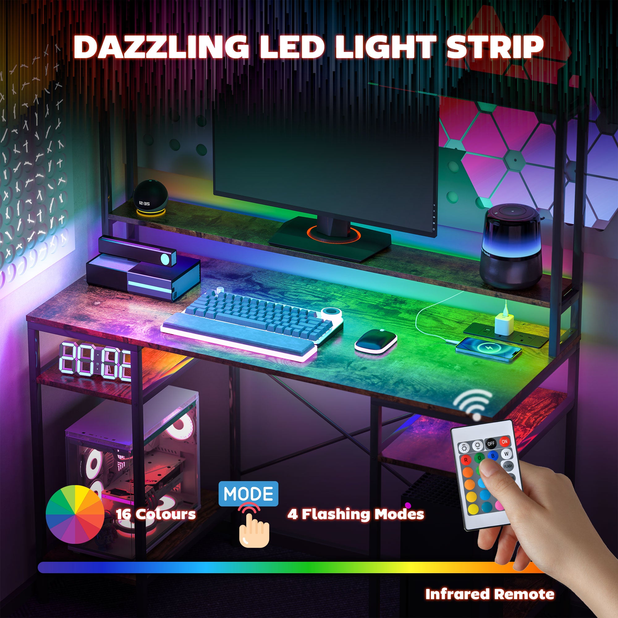 Transform your workspace with the computer desk with storage, designed for both style and functionality. It features a built-in charging station with two power outlets and two USB ports, keeping your devices powered up and organised. Customise the ambiance with RGB LED lights and enjoy the ergonomic monitor stand that promotes comfort with lots of storage options, including shelves and CPU stands. This writing desk helps you keep your home office or study area tidy and efficient.