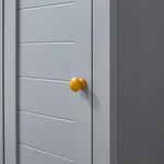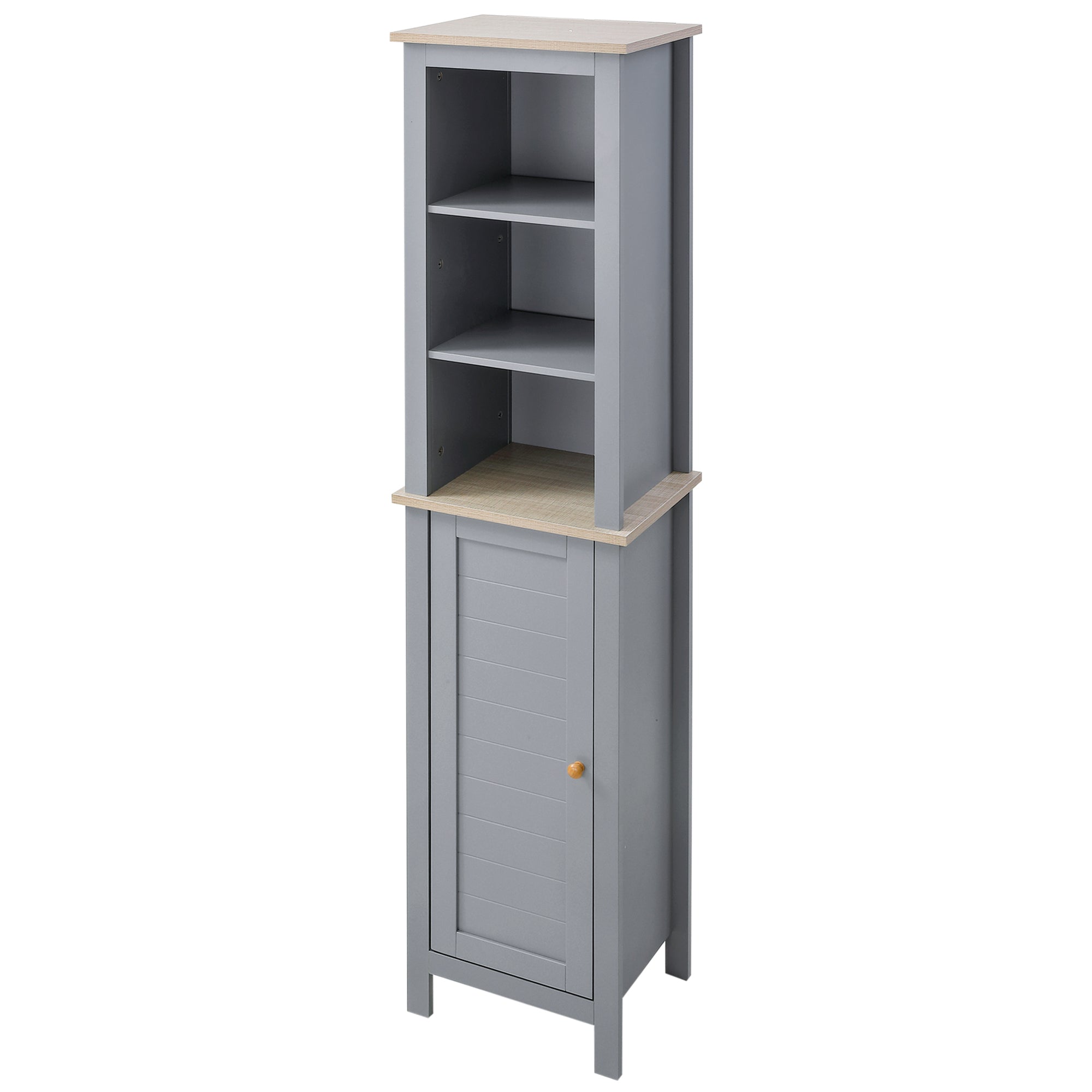 Bathroom storage doesn't always have to be clean and contemporary. If you're looking for something a little different - go for this narrow freestanding cabinet. A slightly boxy shape pairs with the mid-grey tone and the contrasts with the wood-effect panels for some retro rustic charm. It is formed of a bottom cupboard and three upper shelves for decent amount of open and discreet storage. It's made from MDF, so it's durable, with the four stump legs preventing direct contact with the floor. Finished with a wooden handle on the door to open and close easily.