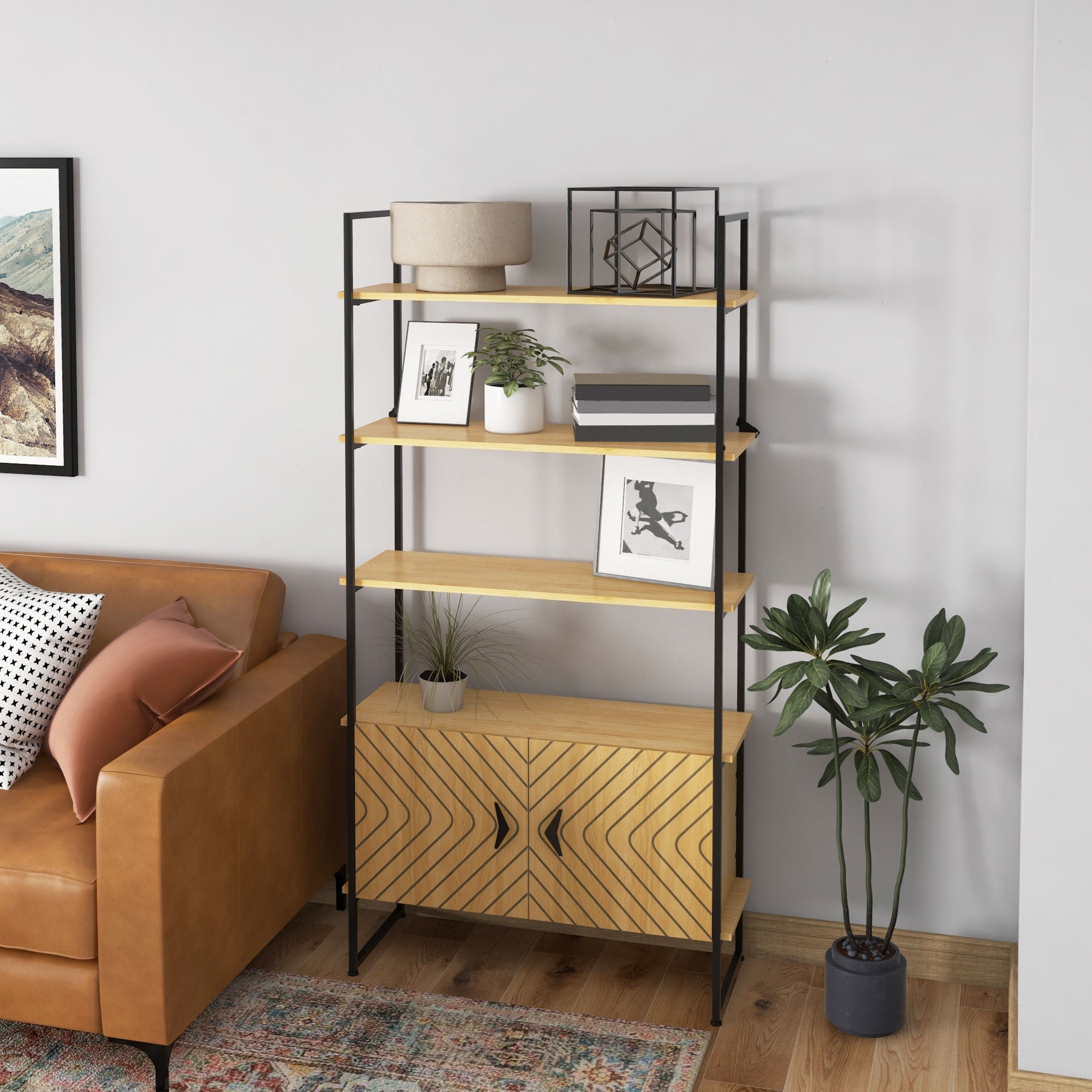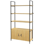 Bookcase 4-Tier Storage Shelf with Double Door Cabinet and Metal Frame for Living Room, Bedroom, Oak Tone