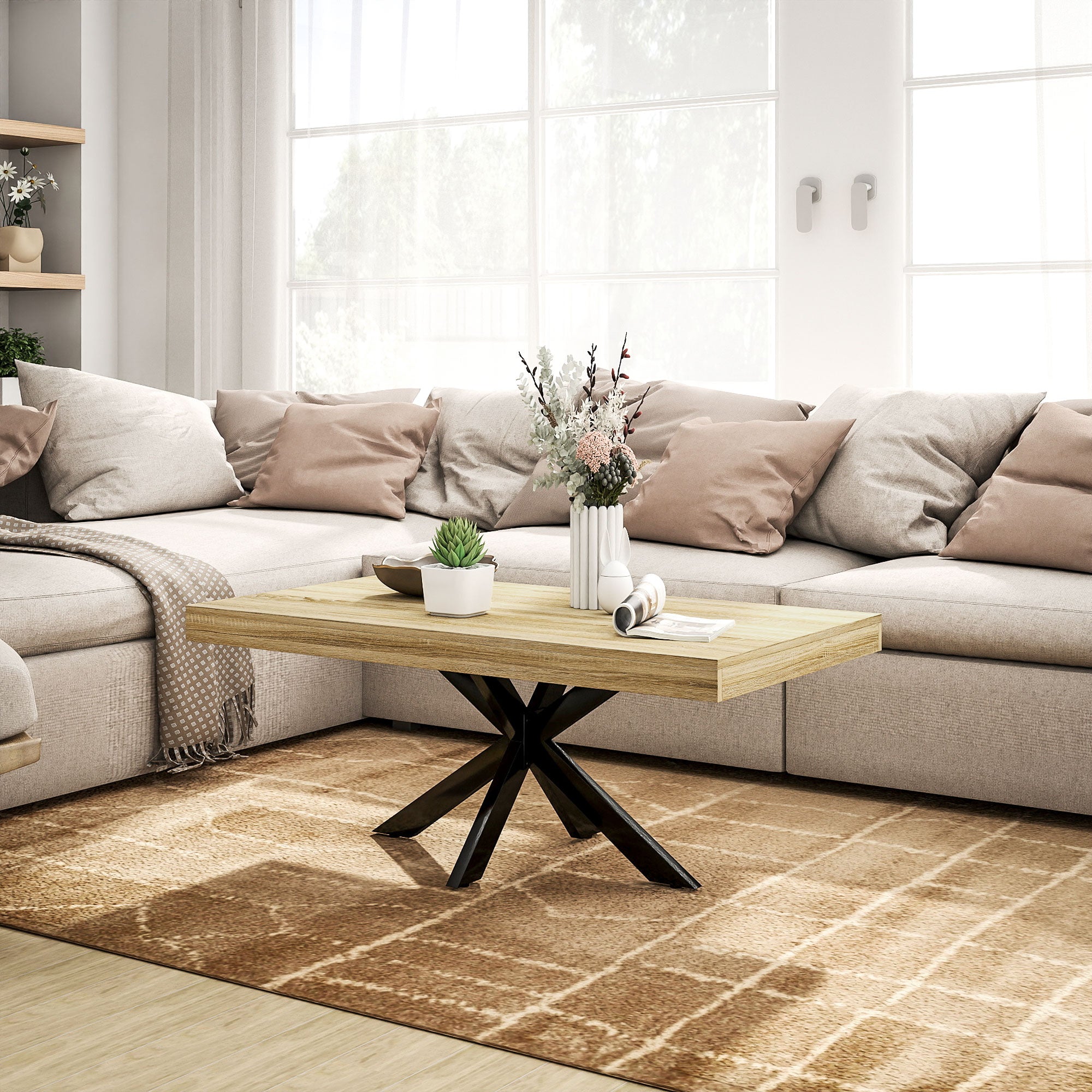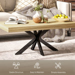 A natural rustic centrepiece for your coffee and lounging times: say hello to this piece. This industrial coffee table comes with a thick particle board wooden top, with a steel cross-legged base: a simple and striking design. The 100 x 60cm table provides plenty of room for holding books, ornaments - and that temporary cup of coffee!