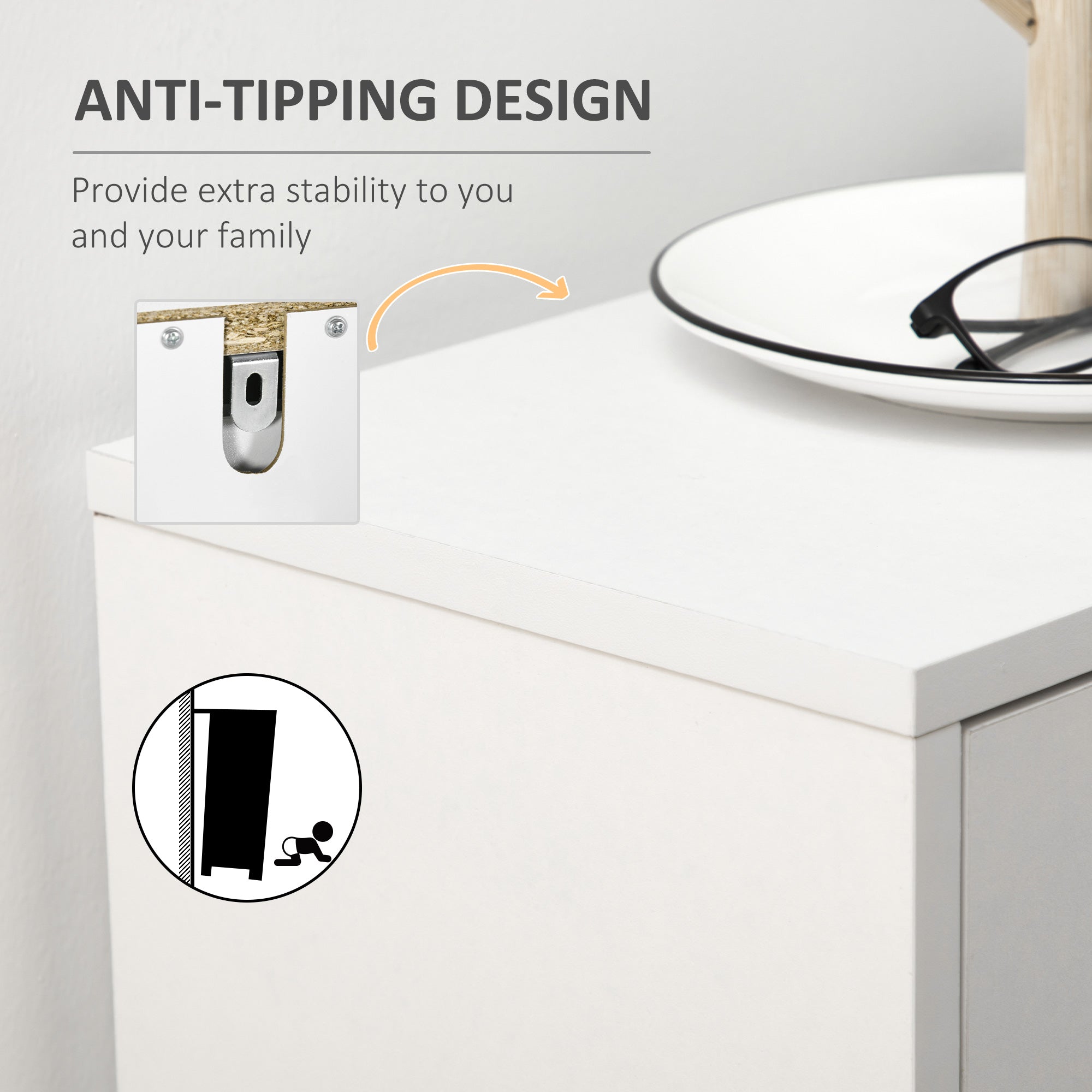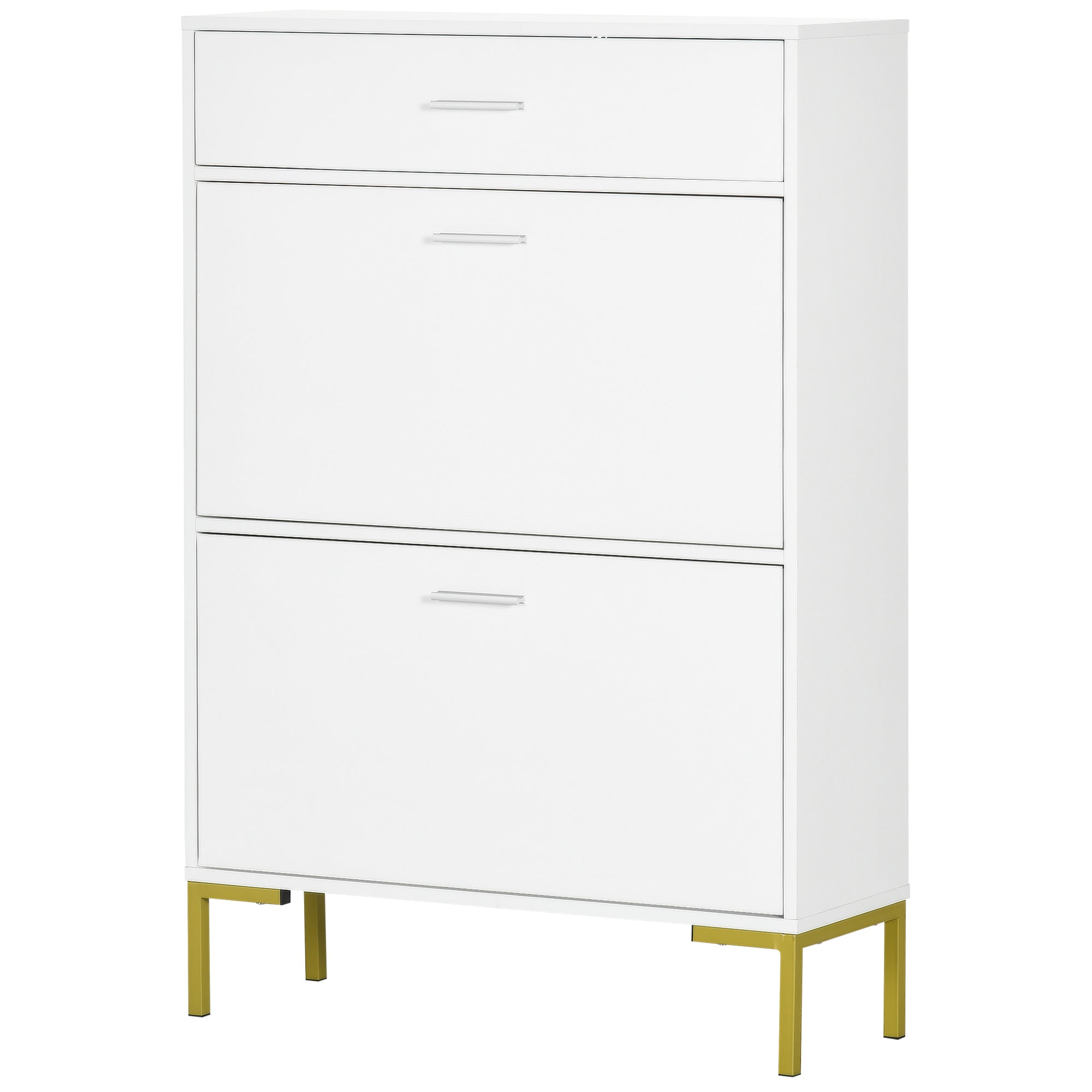 No matter your space, give shoes their own holding space - with full help from this narrow shoe storage cabinet. The two main flip drawers hold up to 12 shoe pairs, with an adjustable shelf in each to cater for different types of shoes. Look to the top drawer for keeping small items together - great for hallway miscellaneous items. The metal legs offer support too; anti-tipping straps come with this slim shoe storage unit to fix safely to a wall.