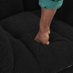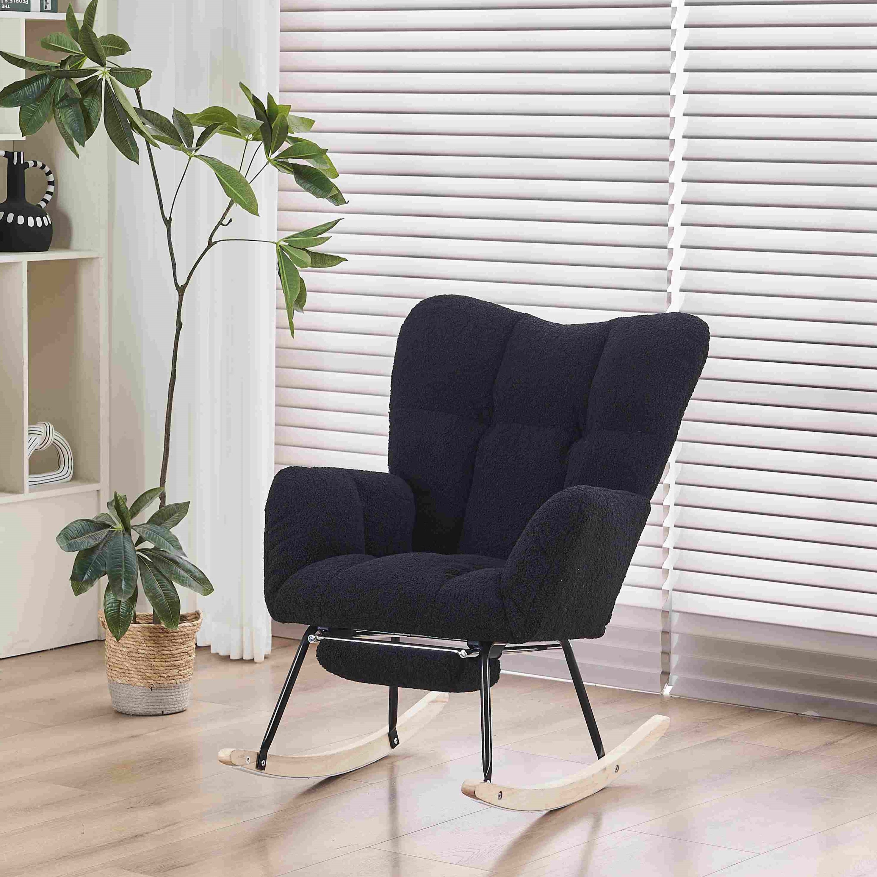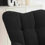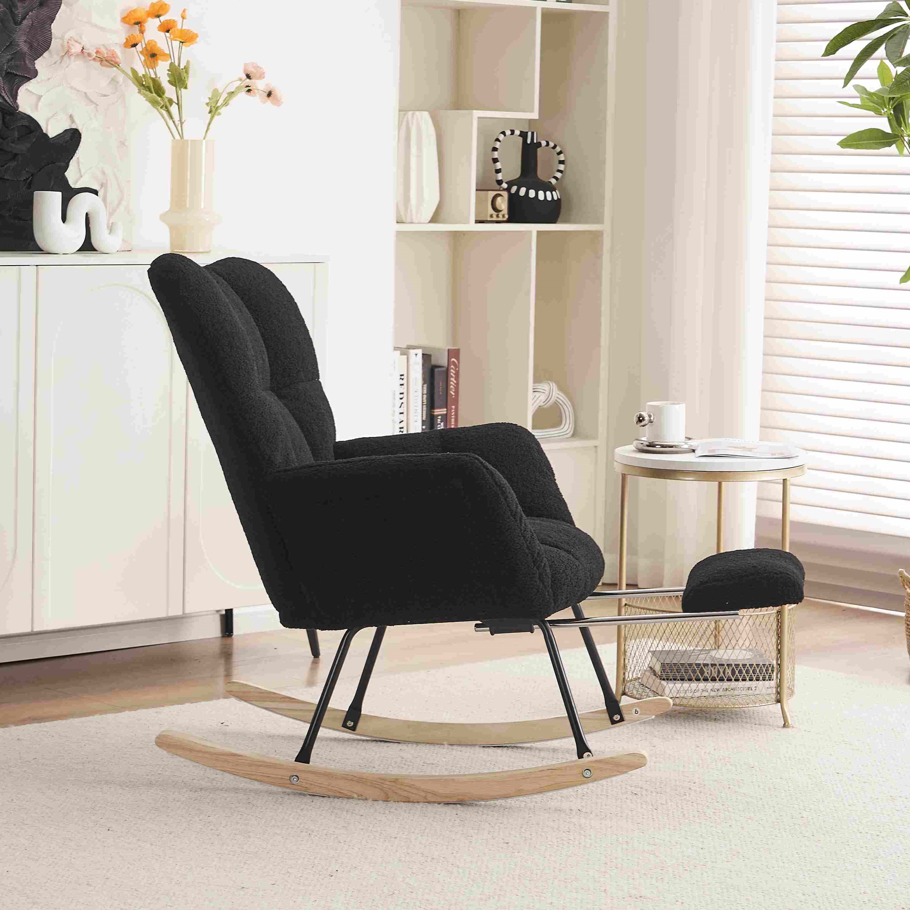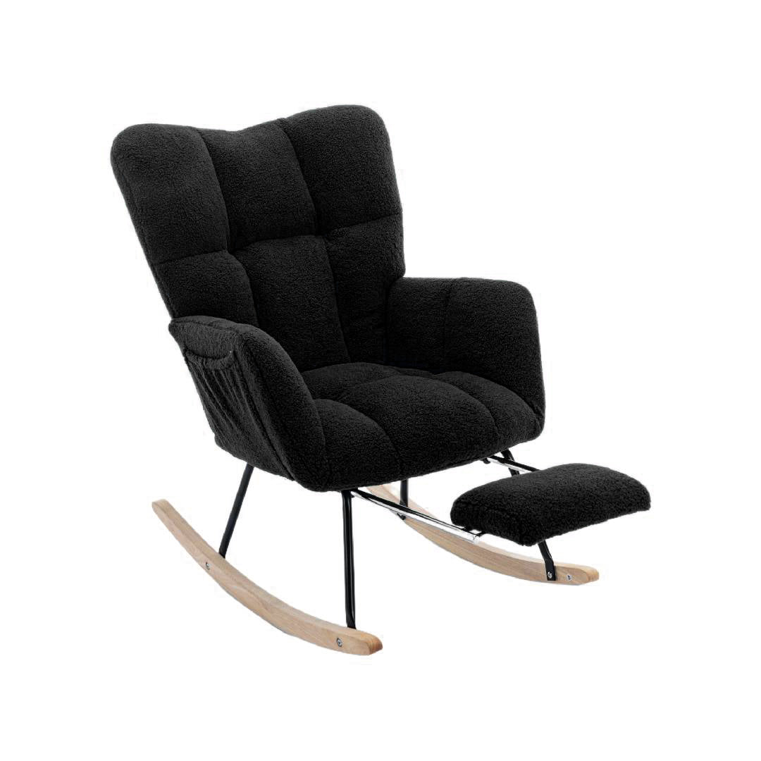Experience ultimate comfort with the New Modern Teddy Fabric Tufted Upholstered Rocking Chair in black. This stylish chair features a pull-out footrest, ergonomic backrest, and double-stitched upholstery for durability. Crafted with a wooden frame, black painted metal base, and wooden rocking legs, it offers both strength and elegance. Easy to assemble in just 15 minutes, this chair is perfect for any indoor space, including the living room, dining room, bedroom, or hallway.