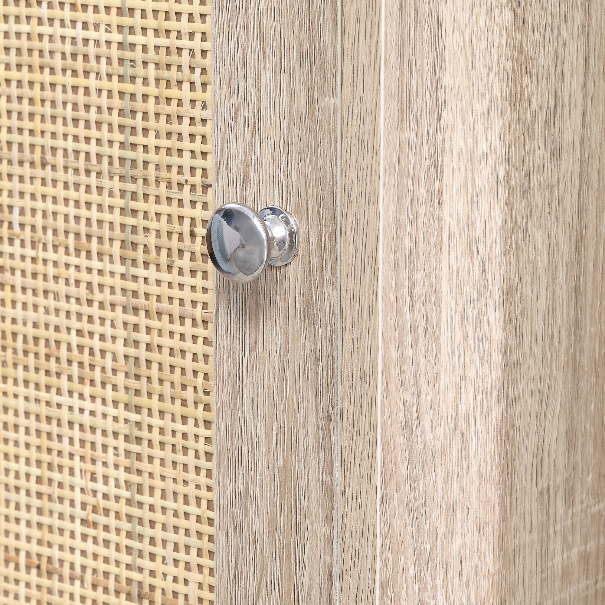 A natural look for a natural home look. This small table blends a wood-effect structure with a front rattan panel - bringing the beauty of nature inside this season. A small cubic design is great for fitting next to your bed or sofa; the structure made from particle board for durability. The inside middle shelf gives you two storage compartments; it is adjustable to different levels to suit you. Complete with polished metal handle.