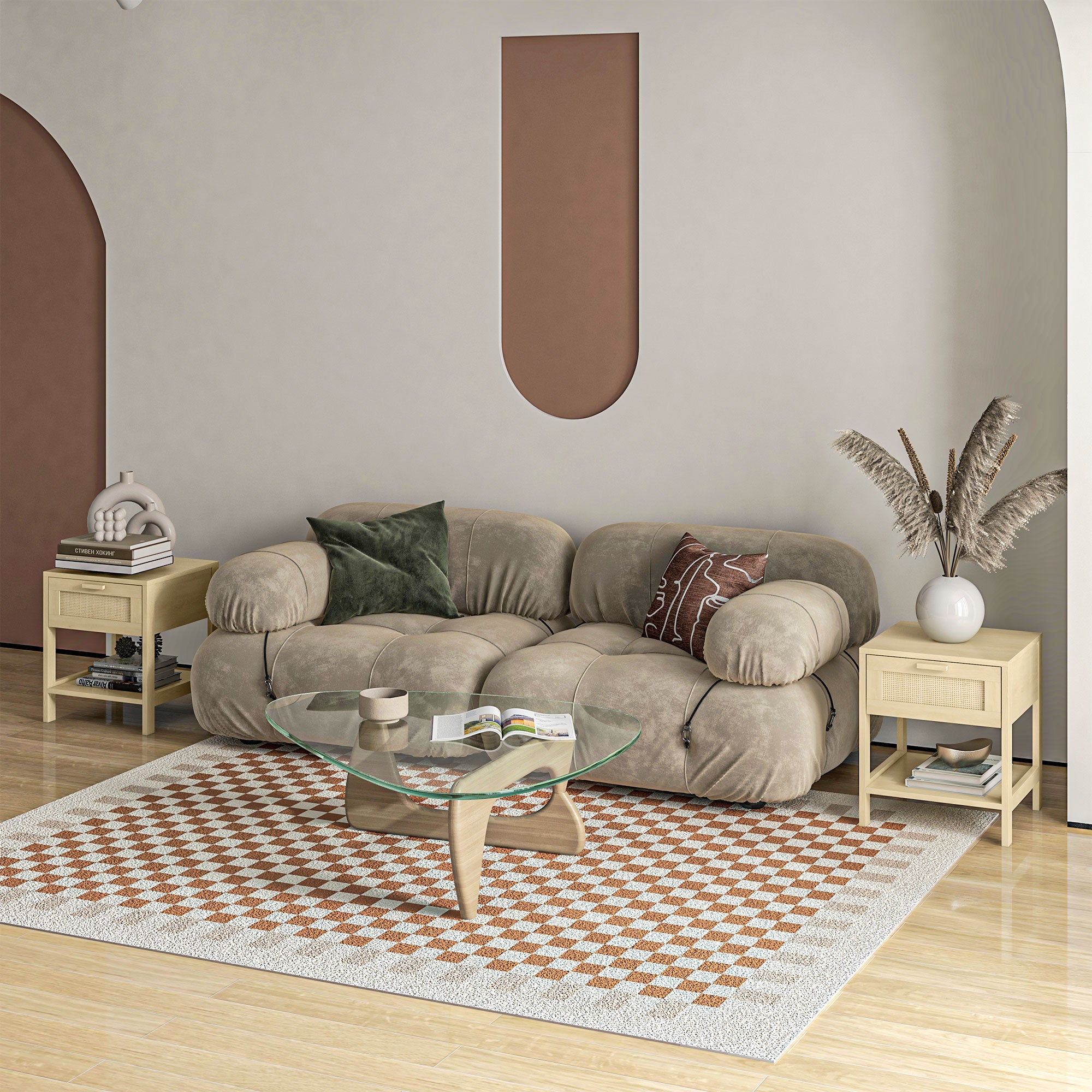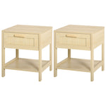 Bedside Table, Nightstand with Rattan Drawer and Storage Open Shelf, Farmhouse Side Table for Bedroom, Living Room, Set of 2
