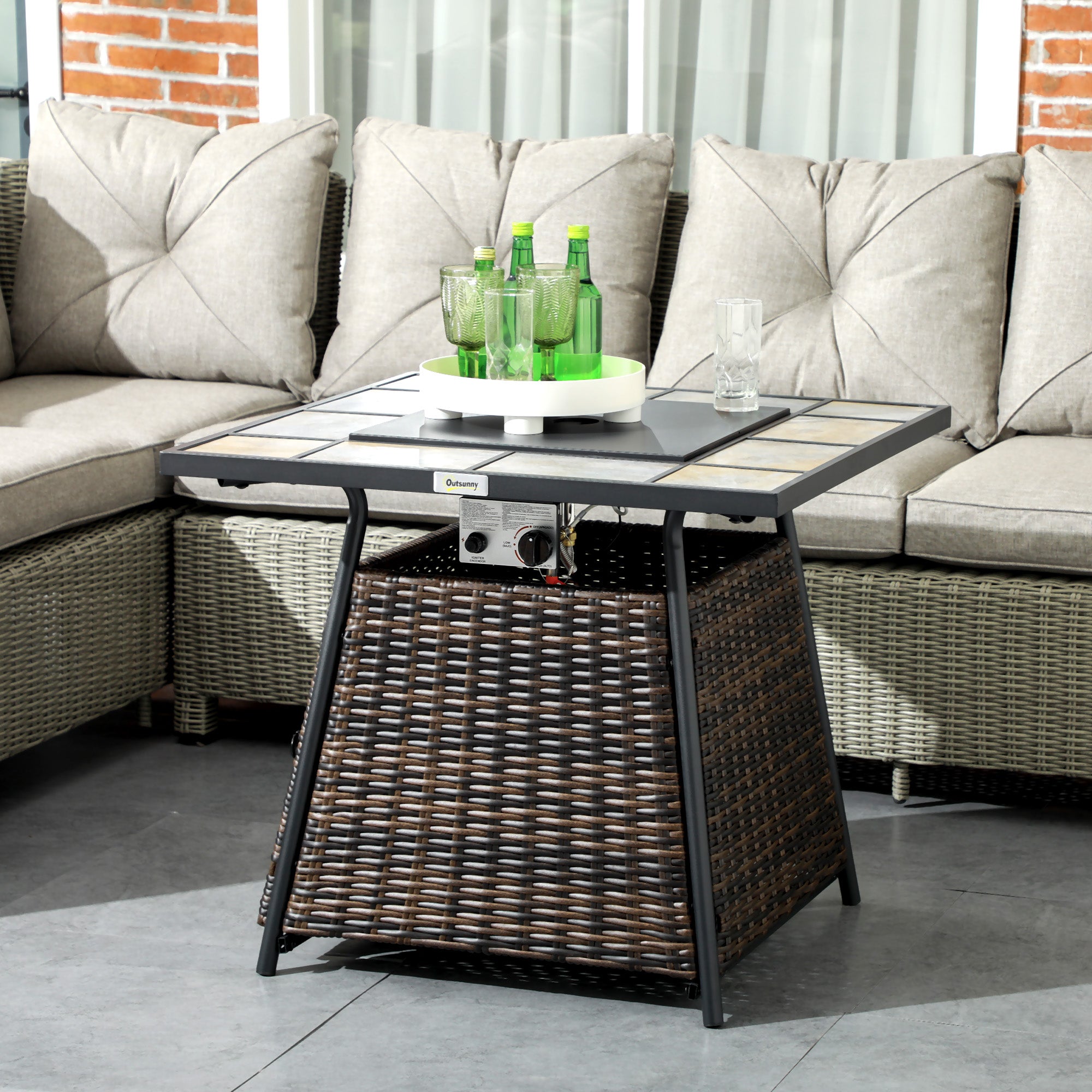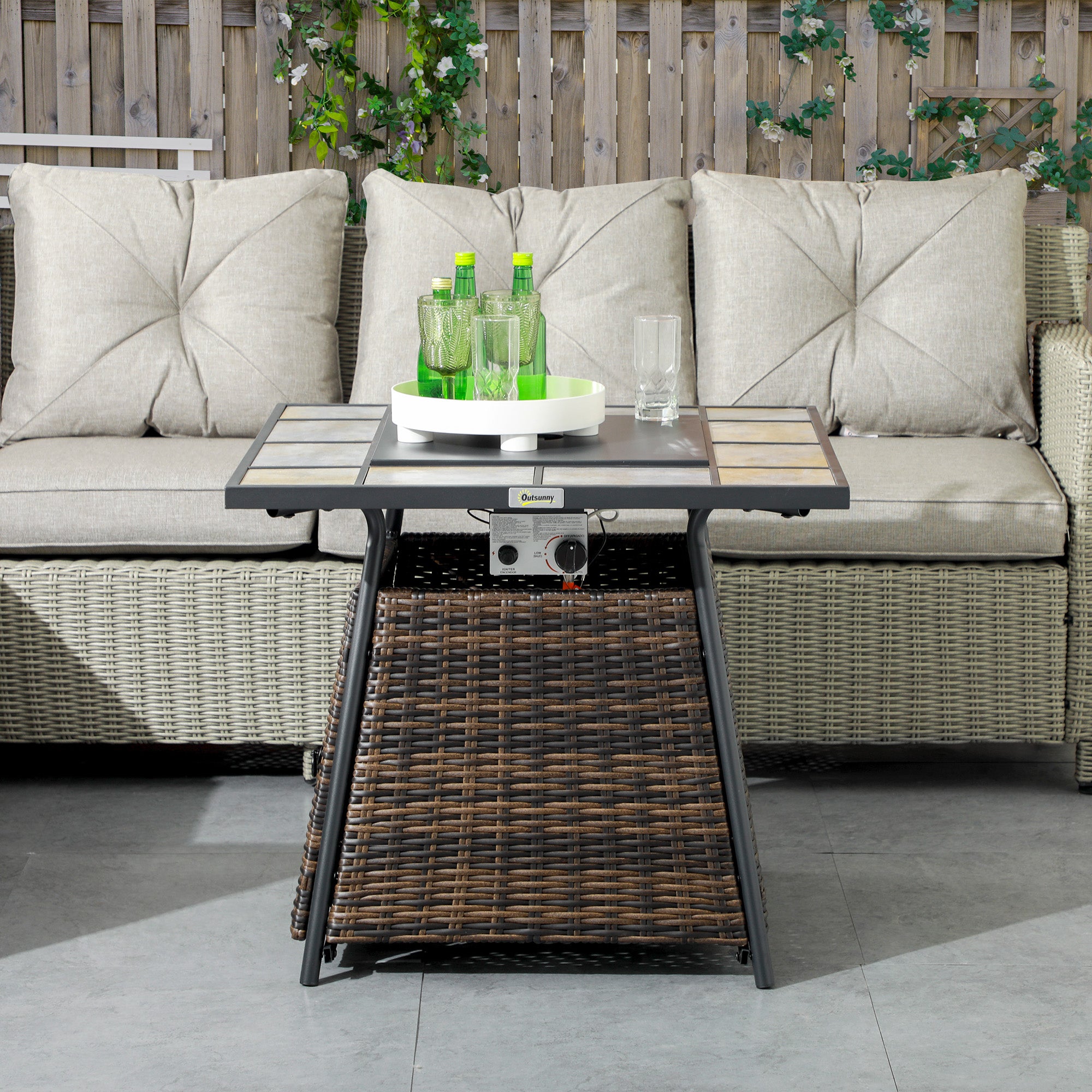 Enjoy garden warmth and ambiance all year-round with this gas fire pit table. Rattan design is stylish and looks great matched with other furniture. The tabletop is fitted with a centre fire pit - the 50,000 BTU burner is powerful and produces a clean, smokeless burn. A lid to cover the burner as a garden table. The flame can be adjusted too. A side door makes it convenient to install the tank. It comes with lava rock, a great addition to the rest of your life.