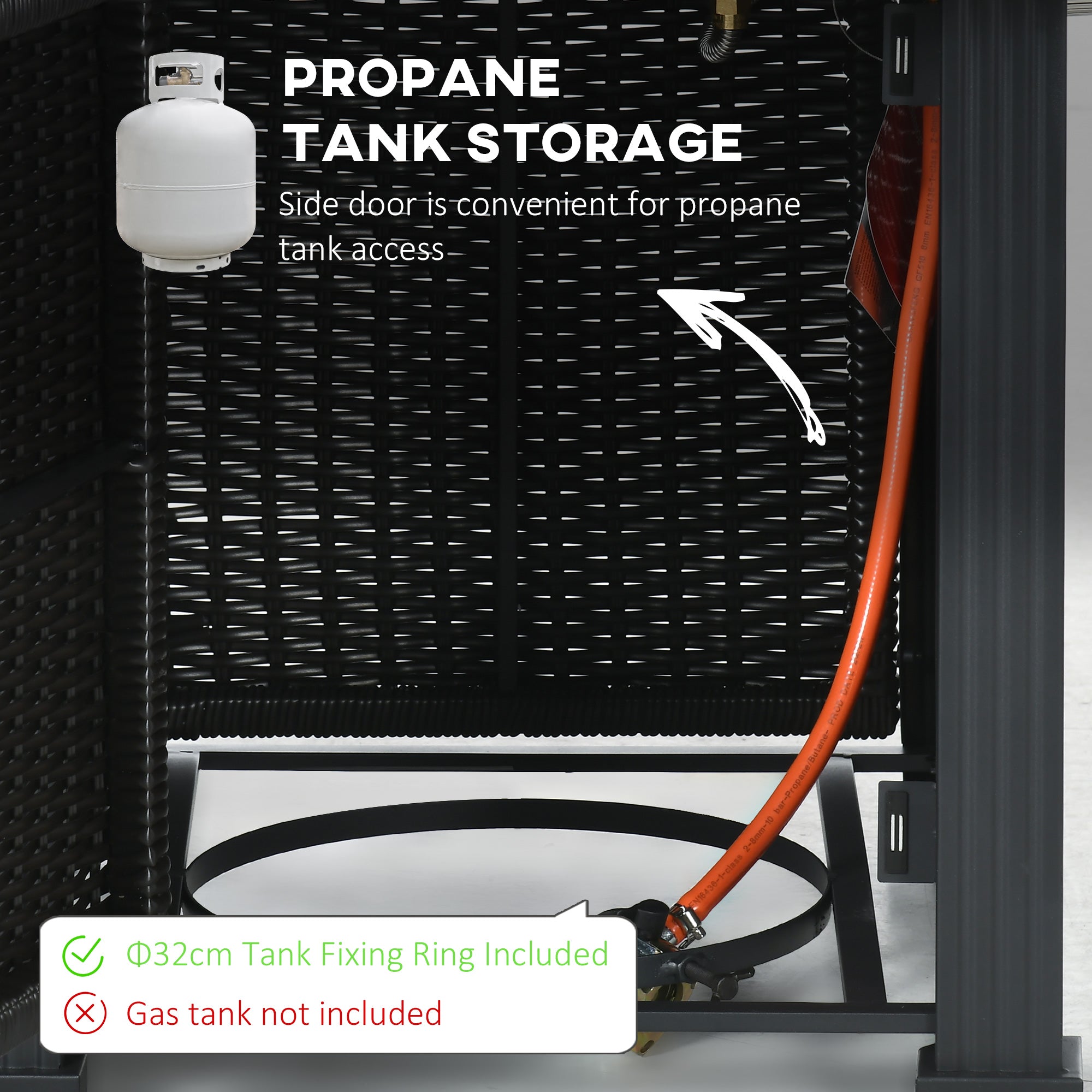 Enjoy garden warmth and ambiance all year-round with this fire pit table. Rattan design is stylish, looks great matched with other furniture. The tabletop is fitted with a centre fire pit - the 50,000 BTU burner is powerful and produces a clean smokeless burn. The flame can be adjusted too. The thermocouple closes the valve if the flame goes out for safety - no leaking gas. Complete with a glass guard, protecting against flying sparks.